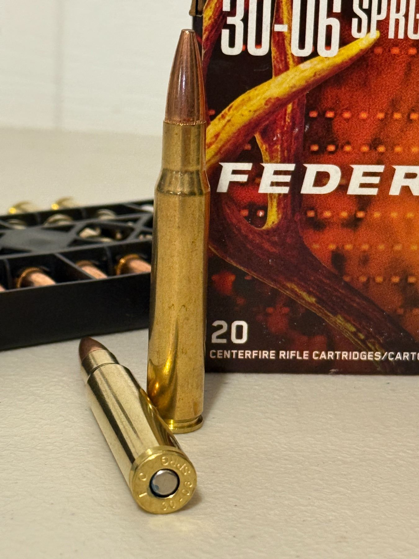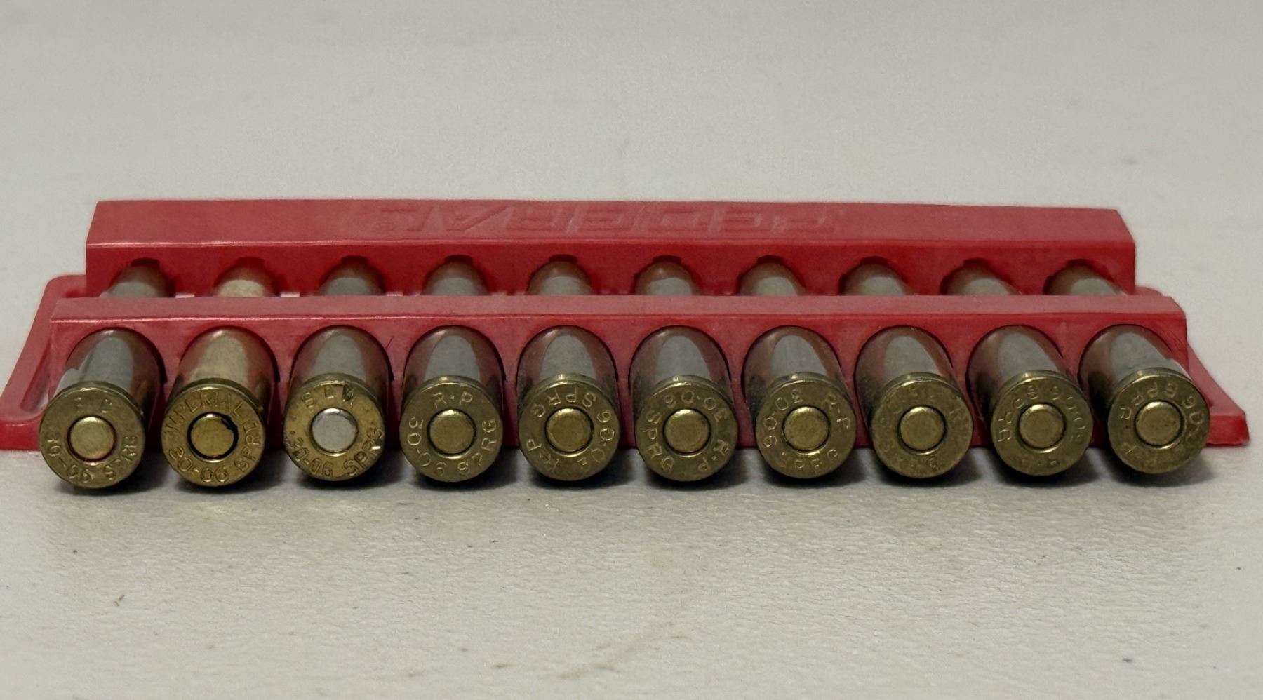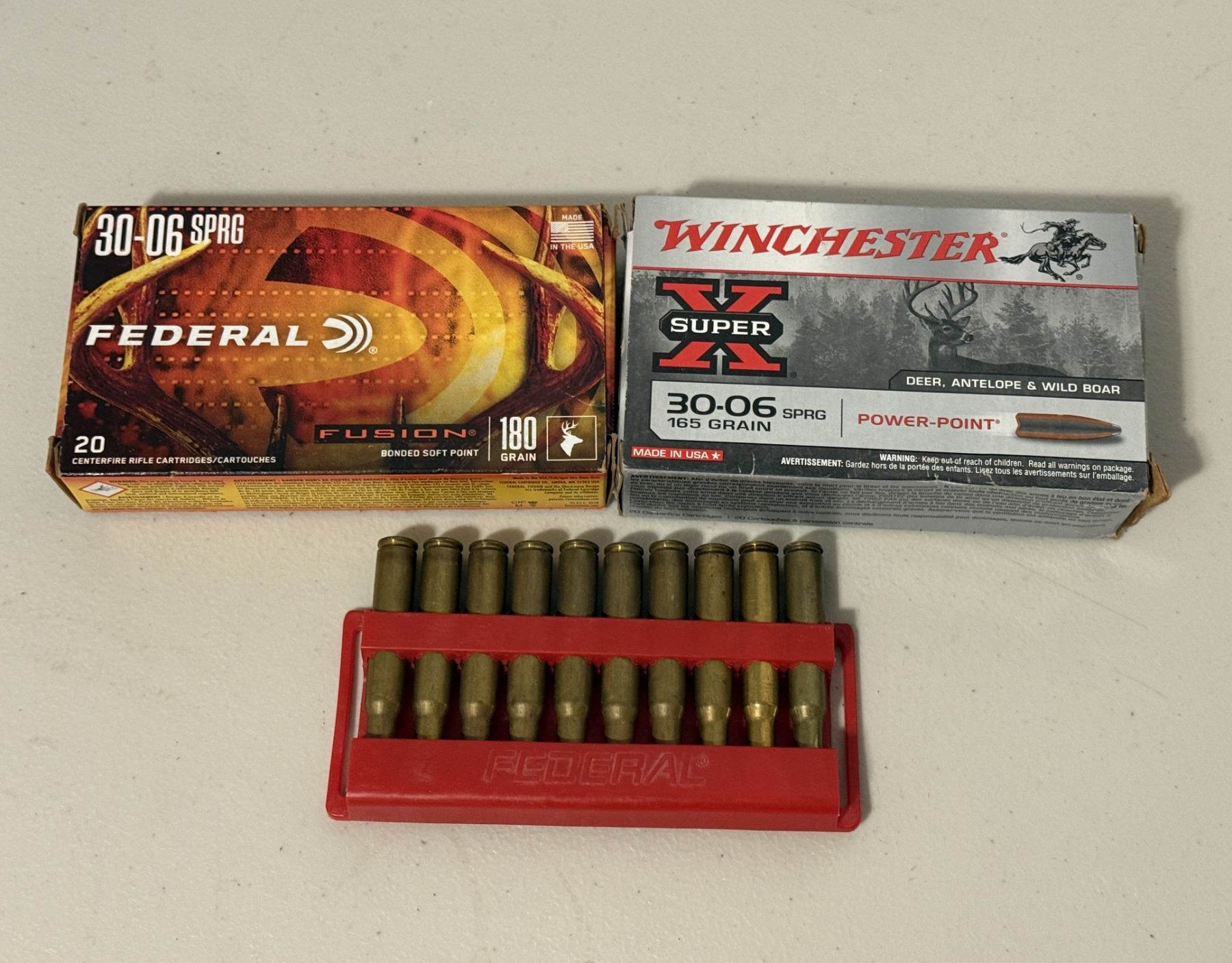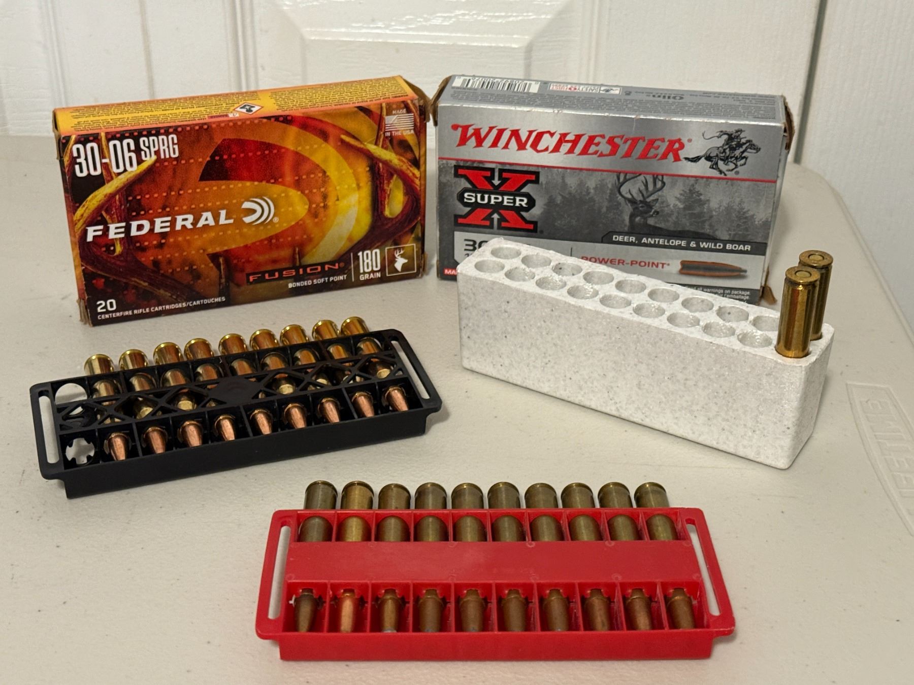 .30-06 Springfield ammunition including Federal Fusion 180gr (qty 9), Winchester Super-X 165gr Power-Point (qty 2) and a mixed tray (qty 10).