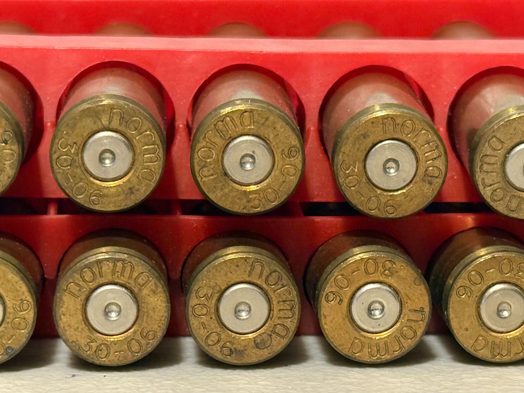 .30-06 SPRG cartridges, stored in plastic ammo trays. Norma headstamp rounds. Quantity= 16. See photos for condition and details.
