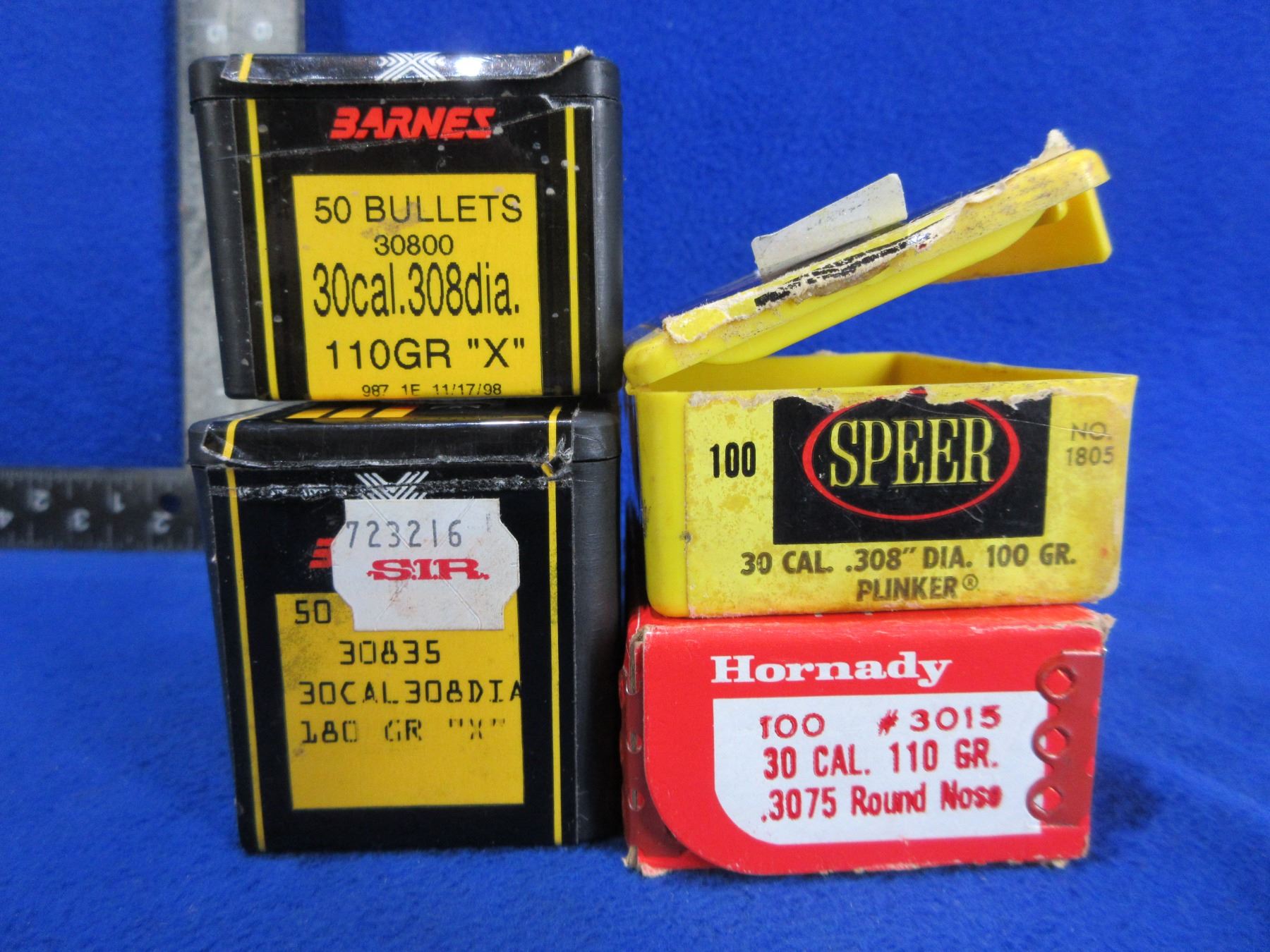 30 Cal. .308" Speer, Hornady and Barnes Bullets - Box of 56 (Speer 100gr Plinker), Box of 84 (Hornady 110gr RN ), Box of 46 (Barnes 180gr X), Box of 50 (Barnes 110gr X)