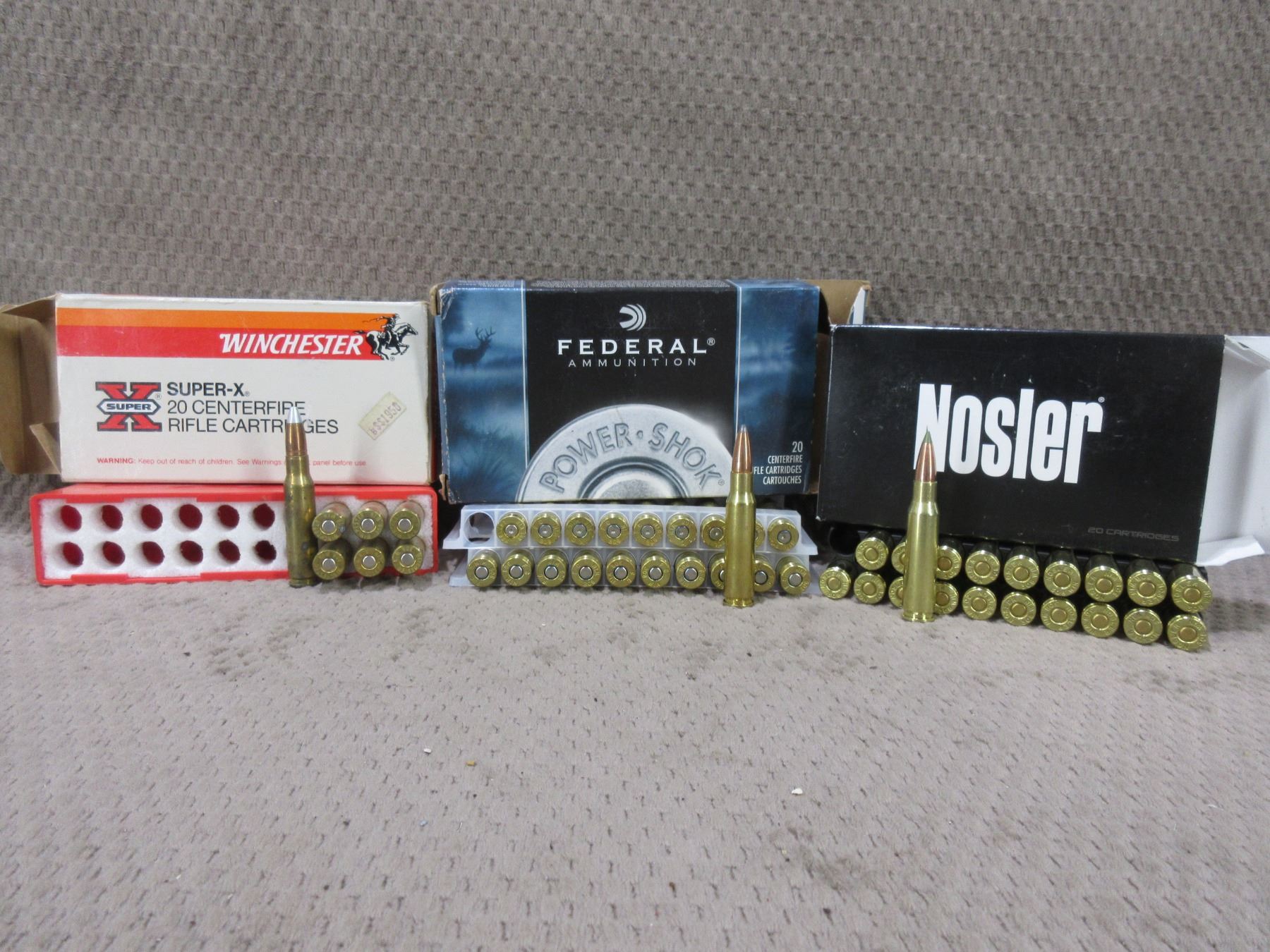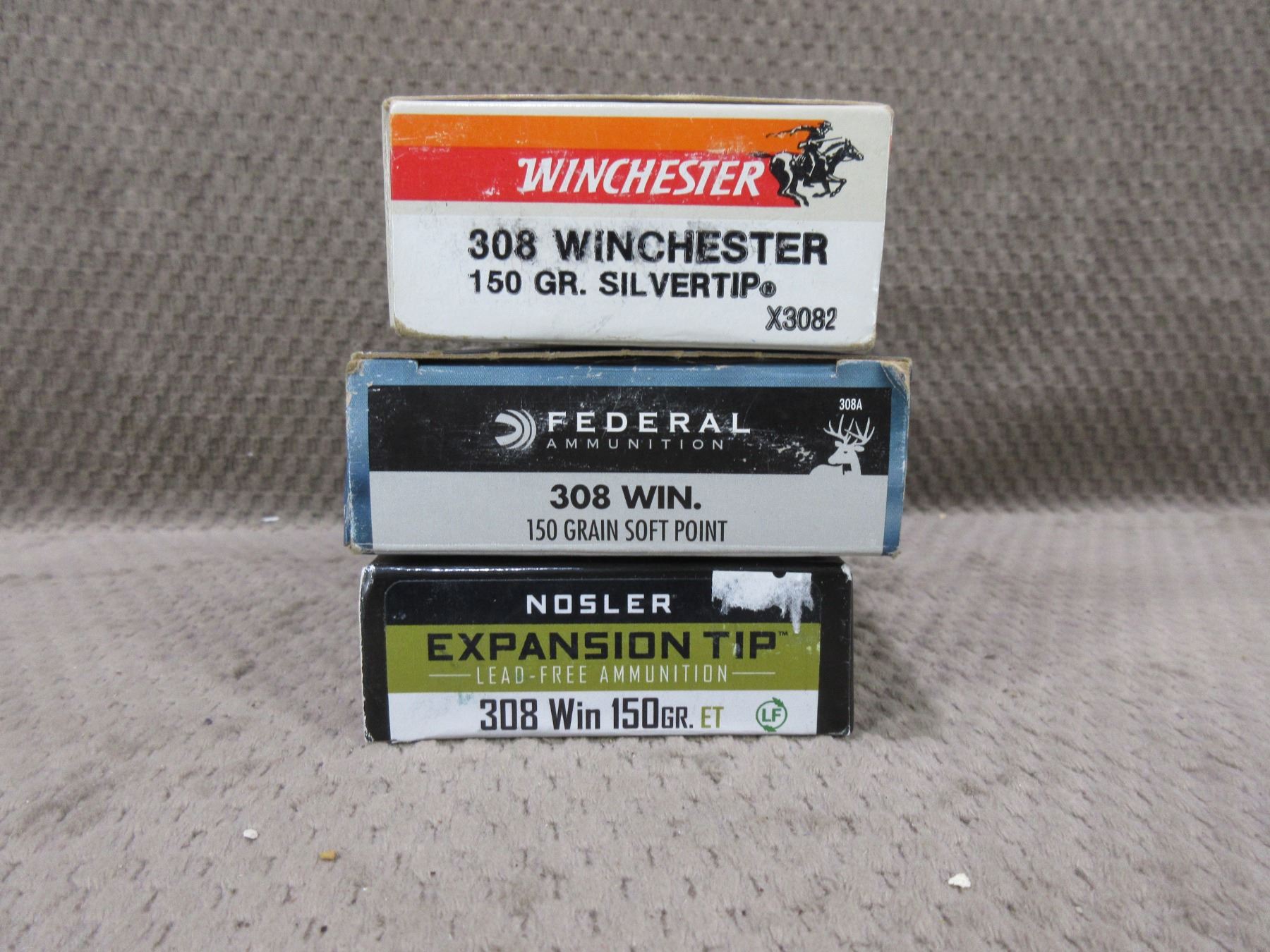 308 Win. 150gr - 3 Boxes - Box 0f 7 Win. SuperX Silvertip, Box of 11 Federal SP + 9 Brass, Box of 20 Nosler ET