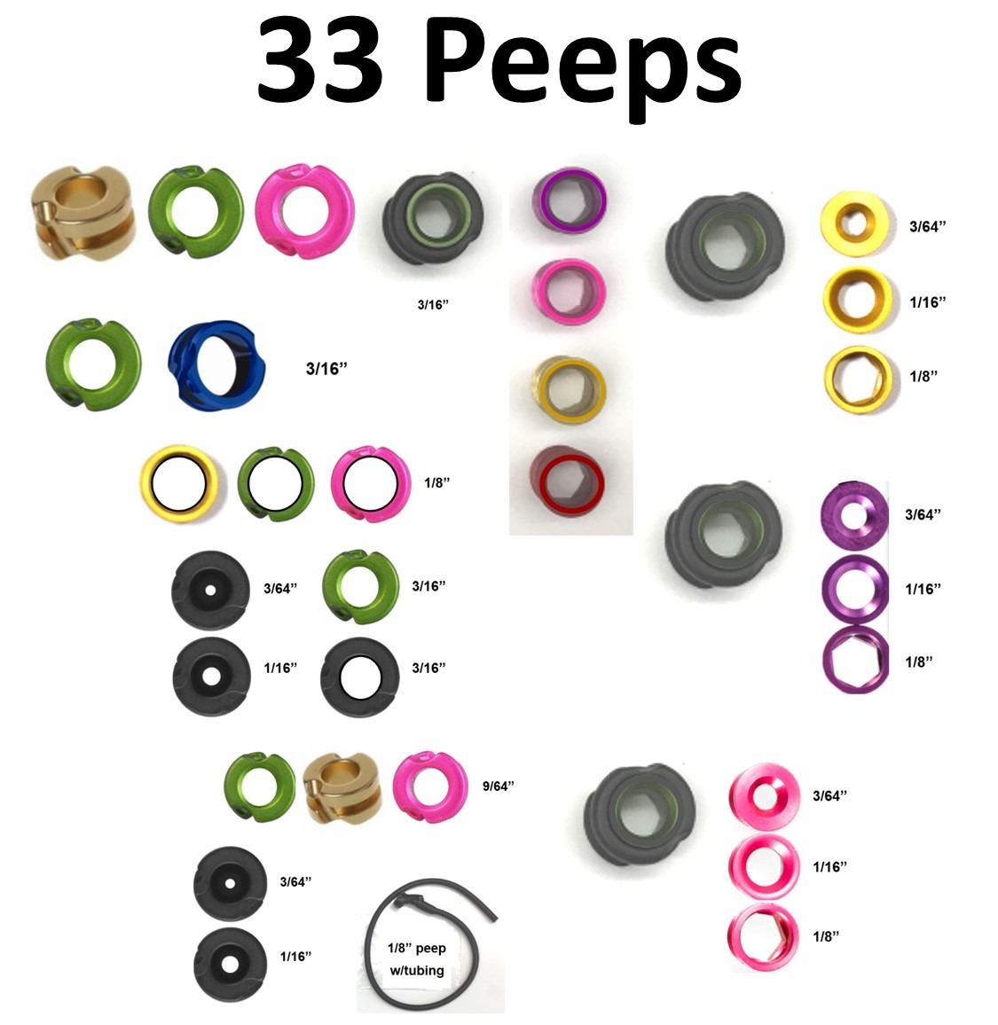 32 x Peeps, 16 x Clearshot Speed Peeps, 3-3/16 Gold, 3-3/16 Green, 3-3/16 Pink, 1-9/64 Pink, 1-9/64 Gold, 1-1/8 Gold, 1-1/8 Green, 1-1/8 Pink, 1-3/16 Black, 2 x Kit of 3/16 Clearshot Peeps, 2 Tone and 4 Inserts, 3 x Kit of Clearshot Peeps, with 2 Tone 3 Pink Inserts, 3 Gold Inserts, 3 Purple Inserts, 4 x Jim Fletcher Tru Peeps, 2-3/64 Small, 2-1/16 Large, 1 x 1/8" Peep with Black Tubing, 6 x G5 3/16 Meta Peeps, 3-Green, 3-Hunter Blue, 1 x G5 Meta Peep 3/16 Green