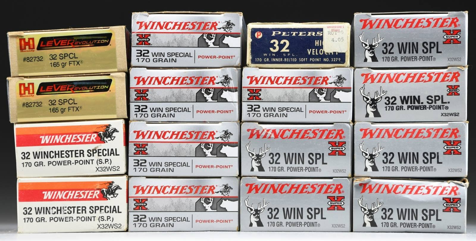 260 RDS. (13 BOXES) Win. 170 gr. Power Point. 20 RDS. (1 BOX) Peters 170 gr. soft point. 40 RDS (2 BOXES) Hornady 165 gr. FTX. CONDITION: vintage box in good condition. Win. & Hornady boxes very good. Ammo appears serviceable. (02-18037-1/MD). $500-625
