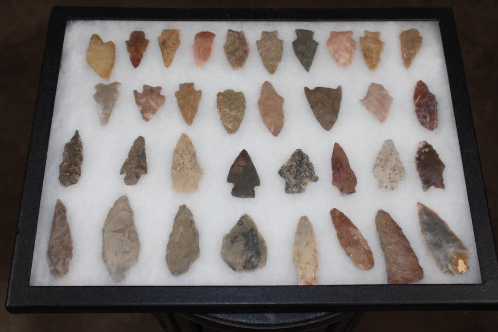 34 Prehistoric Northeast Texas Flint Dart Point ARROWHEADS. These date from the late Woodland Period (1000 BC-1000 AD) to the Early Archaic Period (8000 BC-1000 BC). The Arrowheads measure 1.5" to 3.25" Long. They have been displayed in a Case with Glass that measures 16" Long x 12" Wide. (ONE$) ARROWHEADS