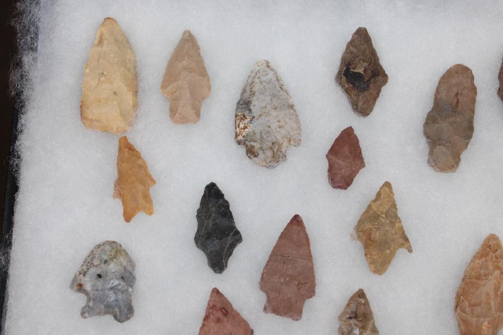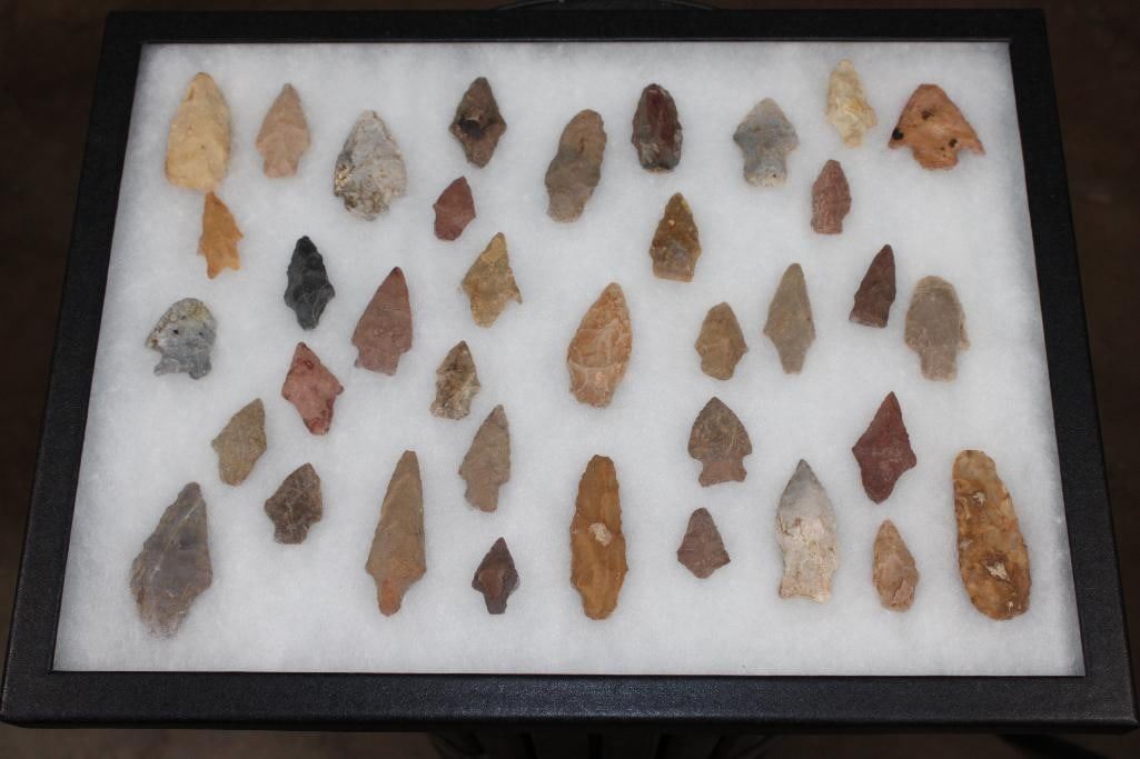 37 Prehistoric Northeast Texas Flint Dart Point ARROWHEADS. These date from the late Woodland Period (1000 BC-1000 AD) to the Early Archaic Period (8000 BC-1000 BC). The Arrowheads measure 1" to 2.5" Long. They have been displayed in a Case with Glass that measures 16" Long x 12" Wide. (ONE$) ARROWHEADS