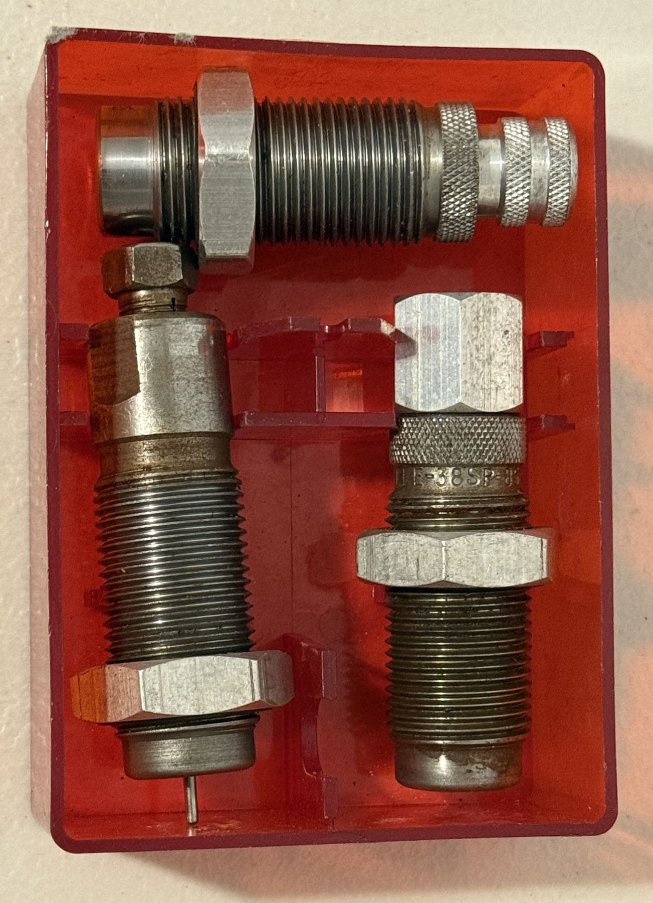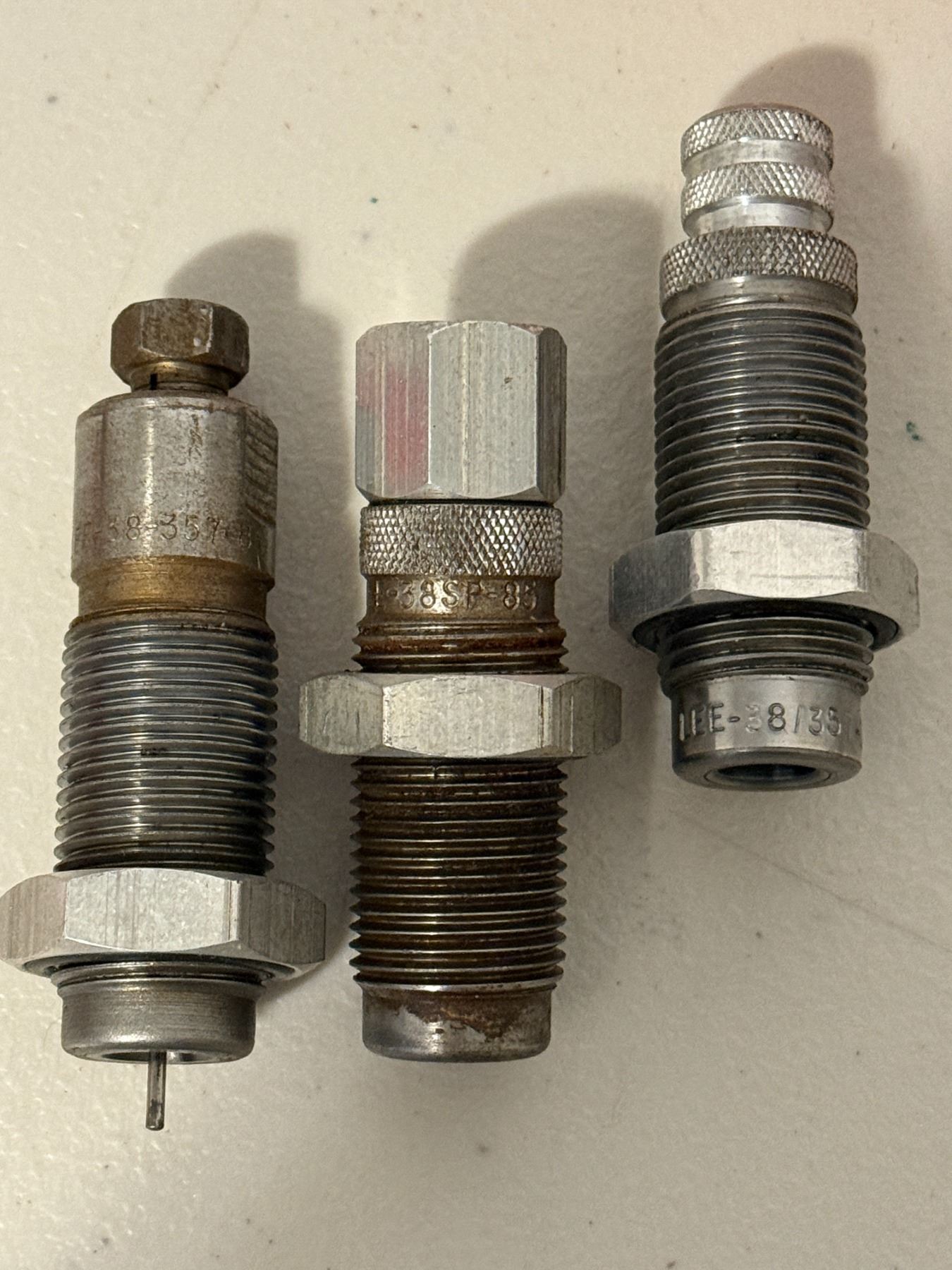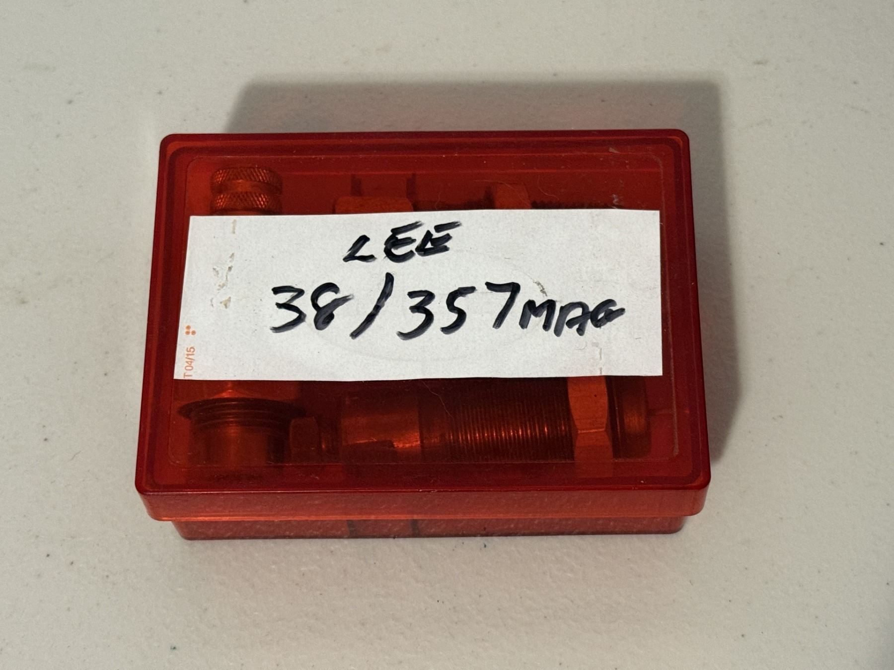 Lee Precision reloading die set for .38 Special / .357 Magnum. Includes dies shown and storage case. Used, in good condition. See photos for details.