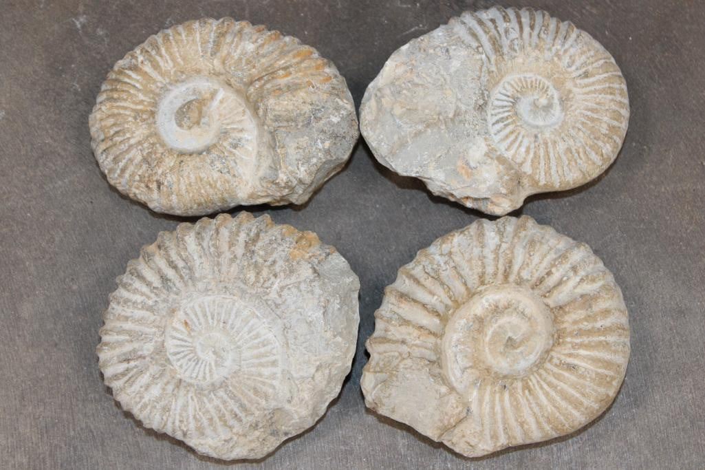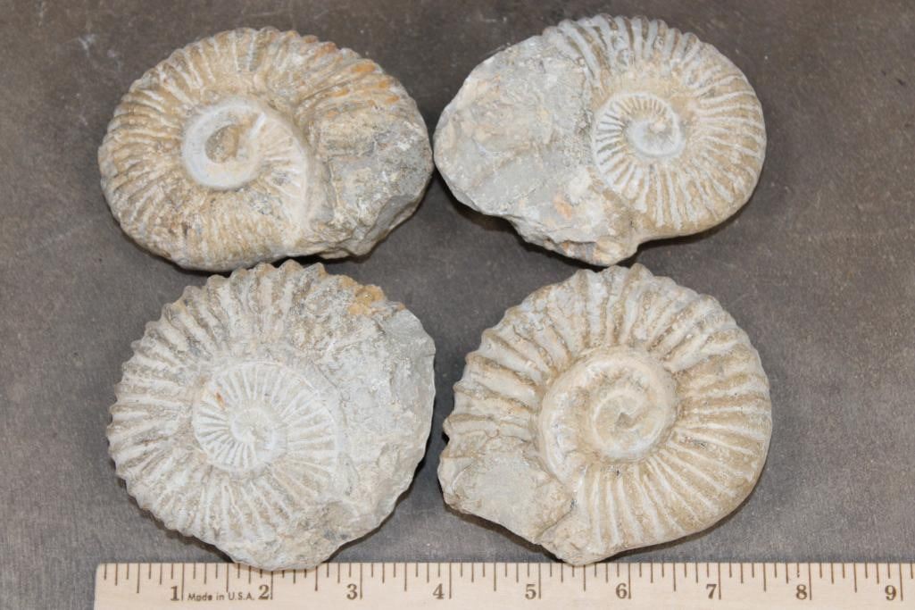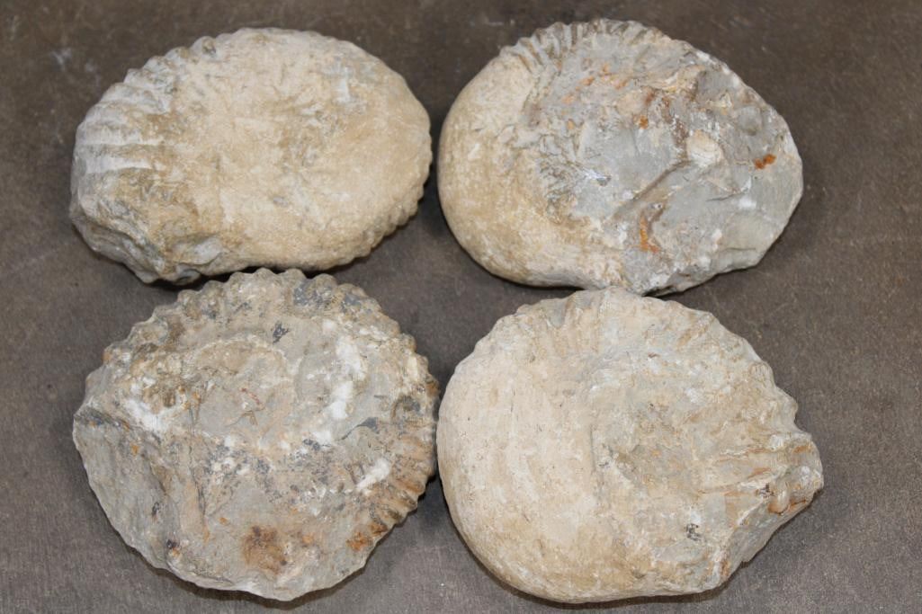 4 AMMONITE FOSSIL Specimens from Morocco. They measure 3.75"-4" Long each. The Total Weight is 3 lbs 3 oz. Ammonites lived during the Mesozoic Era from about 201 to 66 million years ago. (ONE$) ROCKS MINERALS FOSSILS