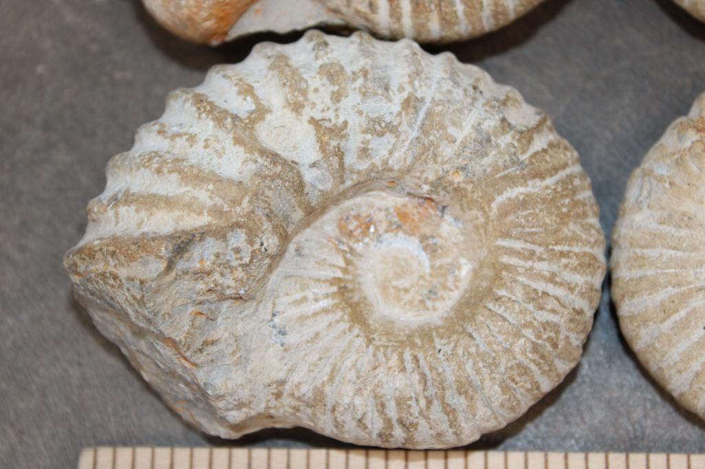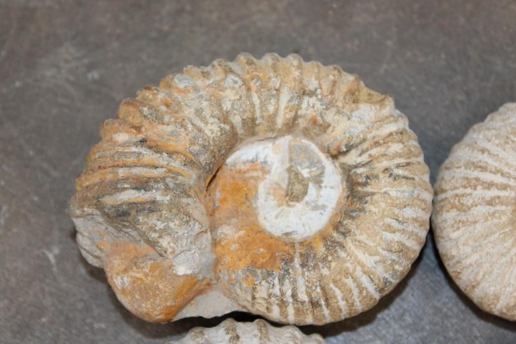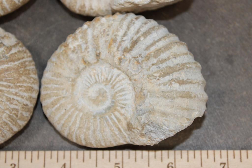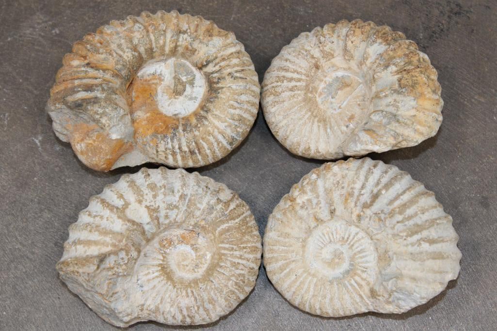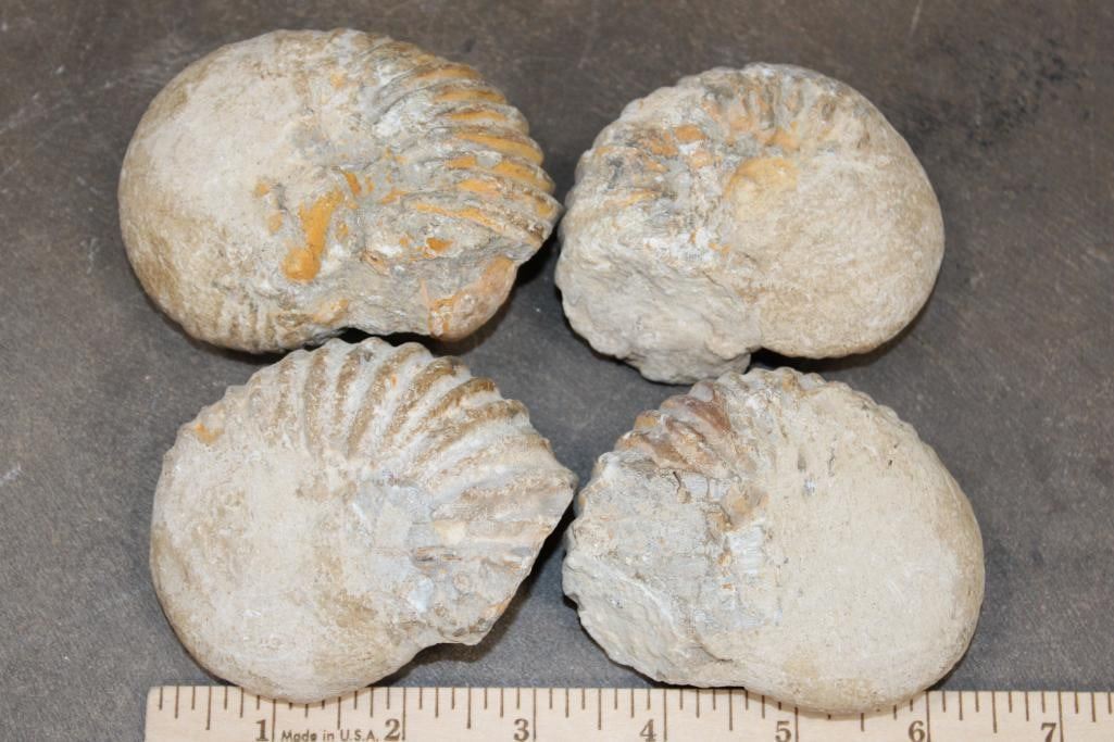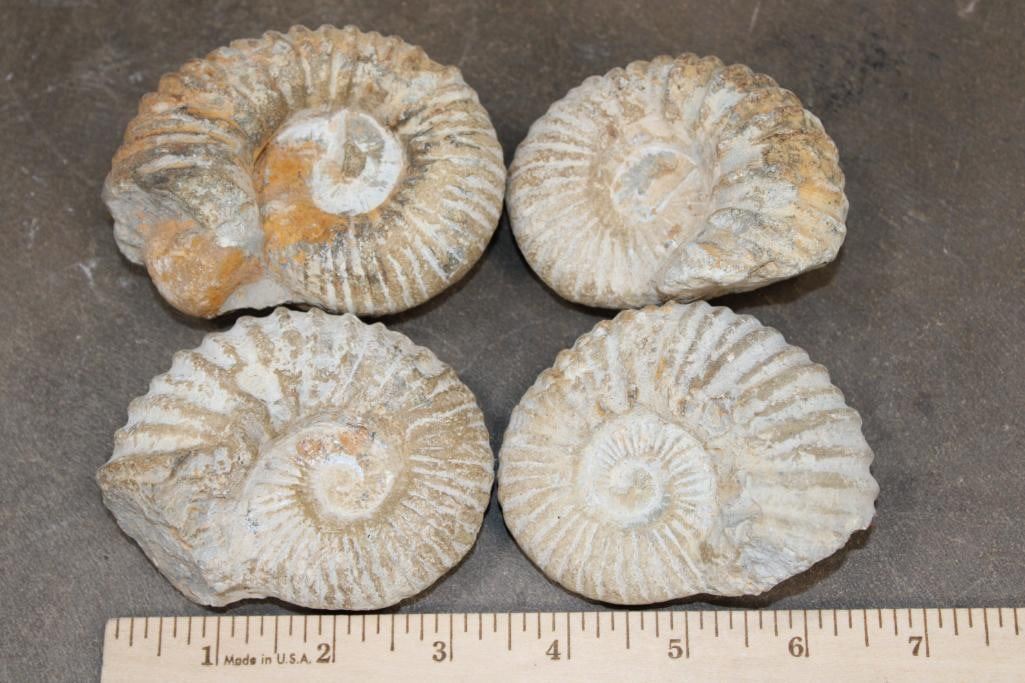 4 AMMONITE FOSSILS from Morocco. They all measures between 3 1/8"-3 5/8" Long and the Total Weight is 2 lbs 3 oz. Ammonites are an extinct group of marine mollusks known for their distinctive coiled shells, which are similar to the modern nautilus. (ONE$) ROCKS MINERALS FOSSILS
