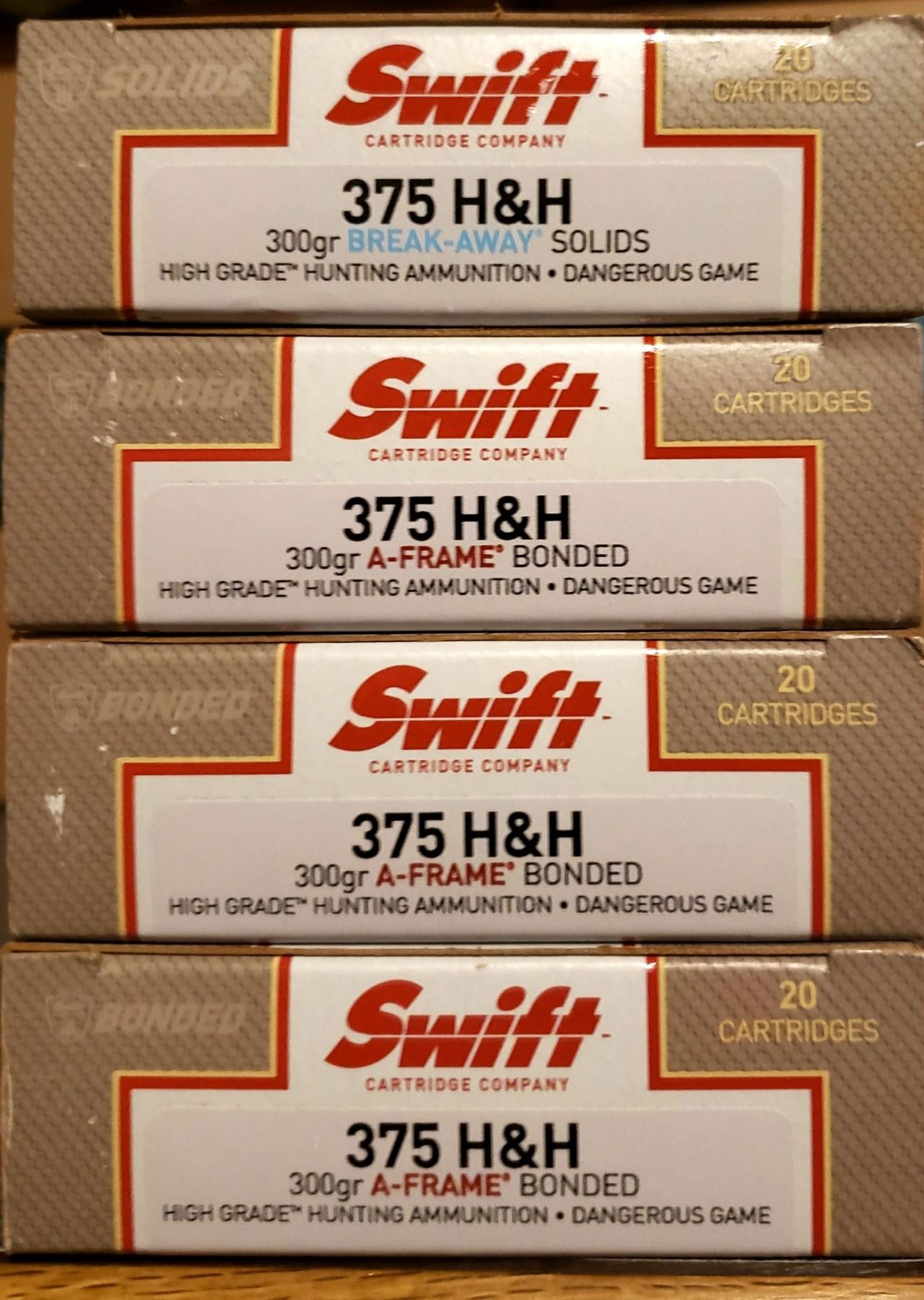 Here's your chance for a safari load of hunting ammuniton for dangerous game. Four (4) boxes of Swift High Grade Hunting Ammunition in .375 H&H. One (1) 20-round box of 300gr Break-Away Solids, three (3) 20-round boxes of 300gr A-Frame Bonded. All boxes are autographed by J. Alain Smith. We thank J. Alain Smith for his 100% donation! https://choiceammunition.com, https://www.swiftbullets.com, https://jalainsmith.com, http://linkswildsafaris.com, https://www.globalrescue.com, https://safariclub.org, https://kryptek.com. Hazardous material shipping requirement cost is the responsibility of the buyer.