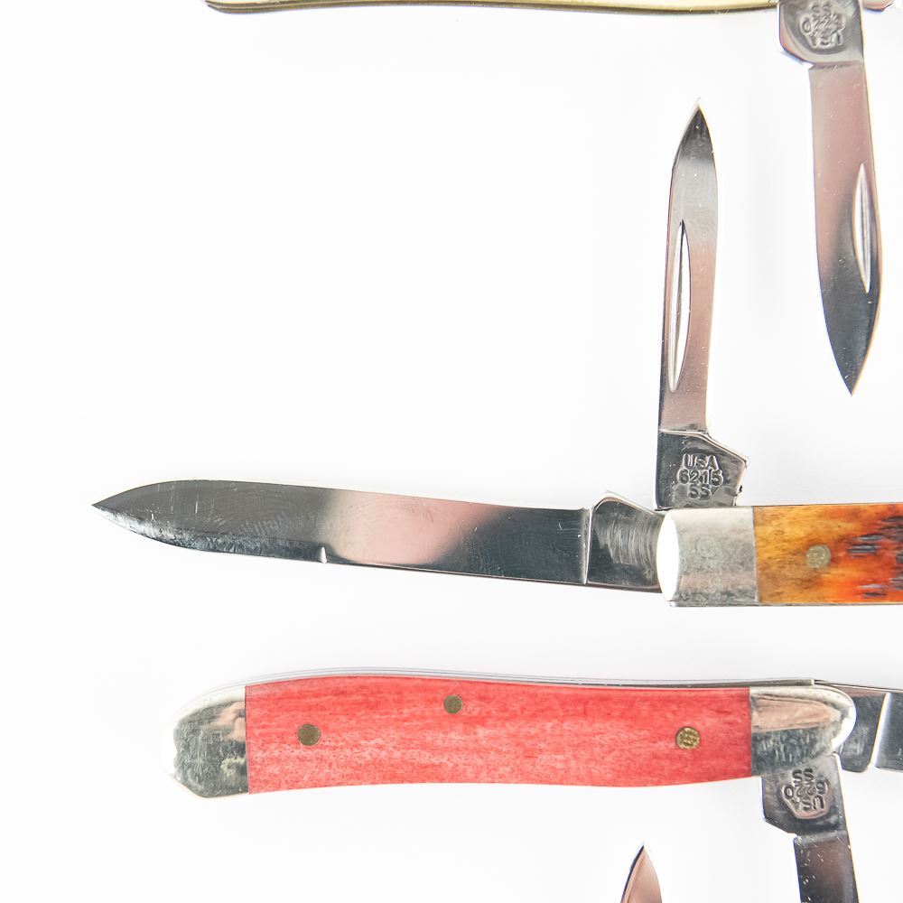 4 Case XX USA made pocket knives. 2 each of two different models, 6220 and 6215. All knives are like new with only storage wear on bolsters. Blades are factory razor sharp. Excellent gift or collector lot. 2.75-3" closed length. See photos.