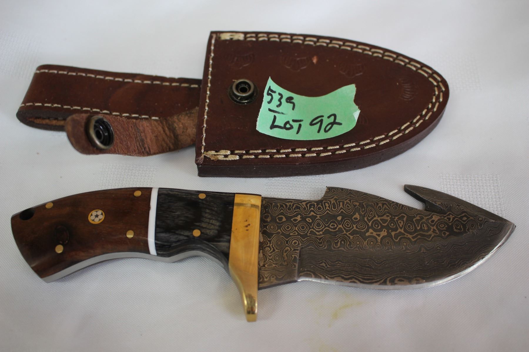 4" Damascus Knife w/Gut Hook, Buffalo Horn/Wood Handle & Brass Guard