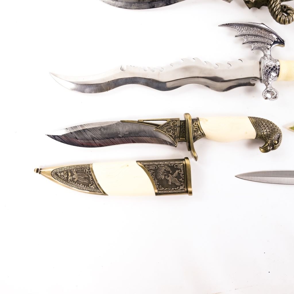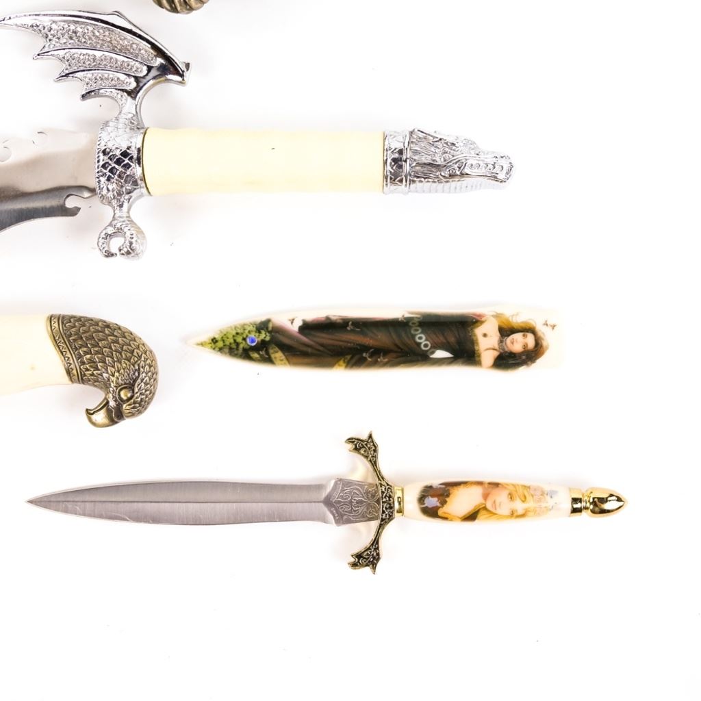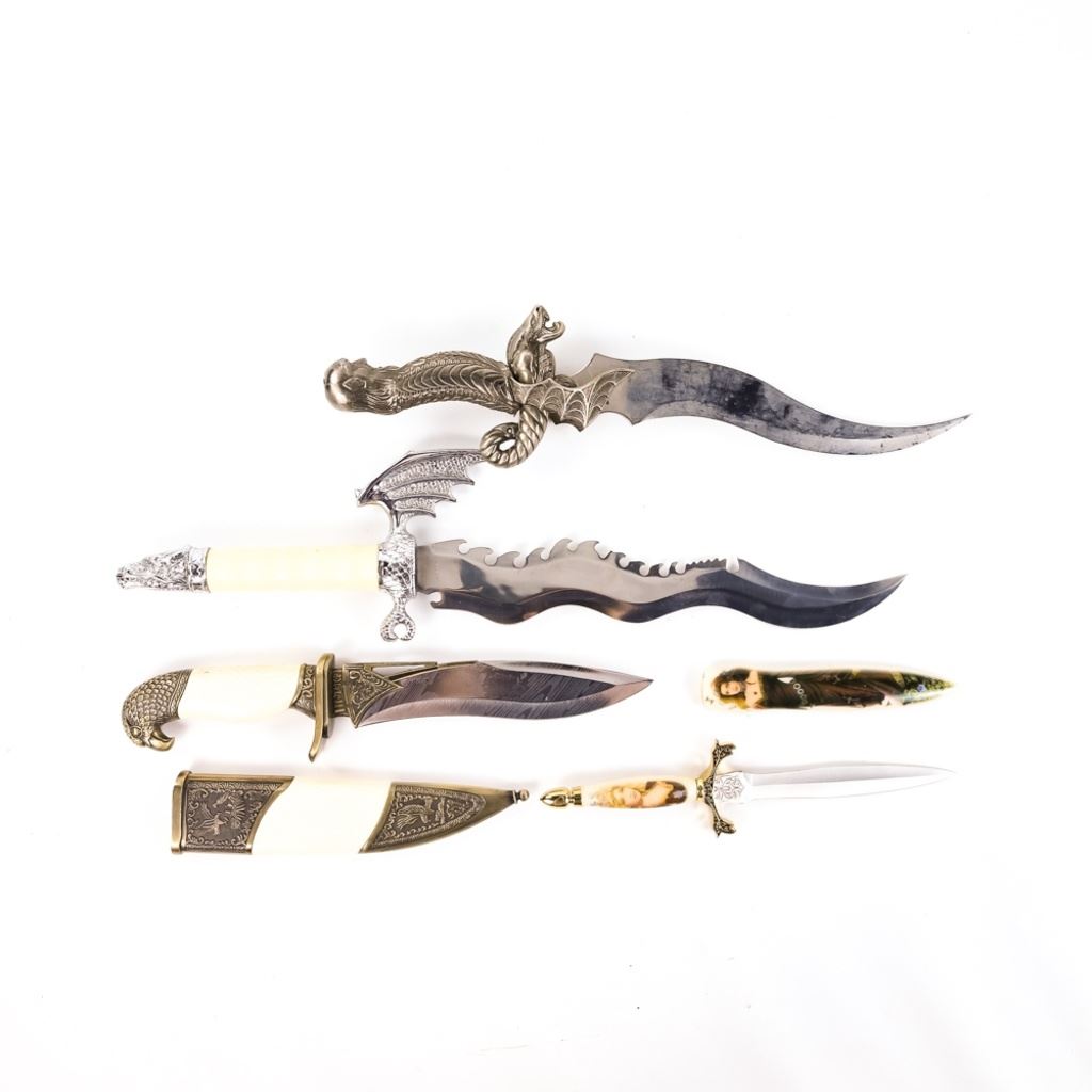 4 Imported Fantasy display daggers. Various designs and blade patterns. Condition ranges from good to brand new. Lengths vary from 12" to 22". See Photos. Very neat display items.