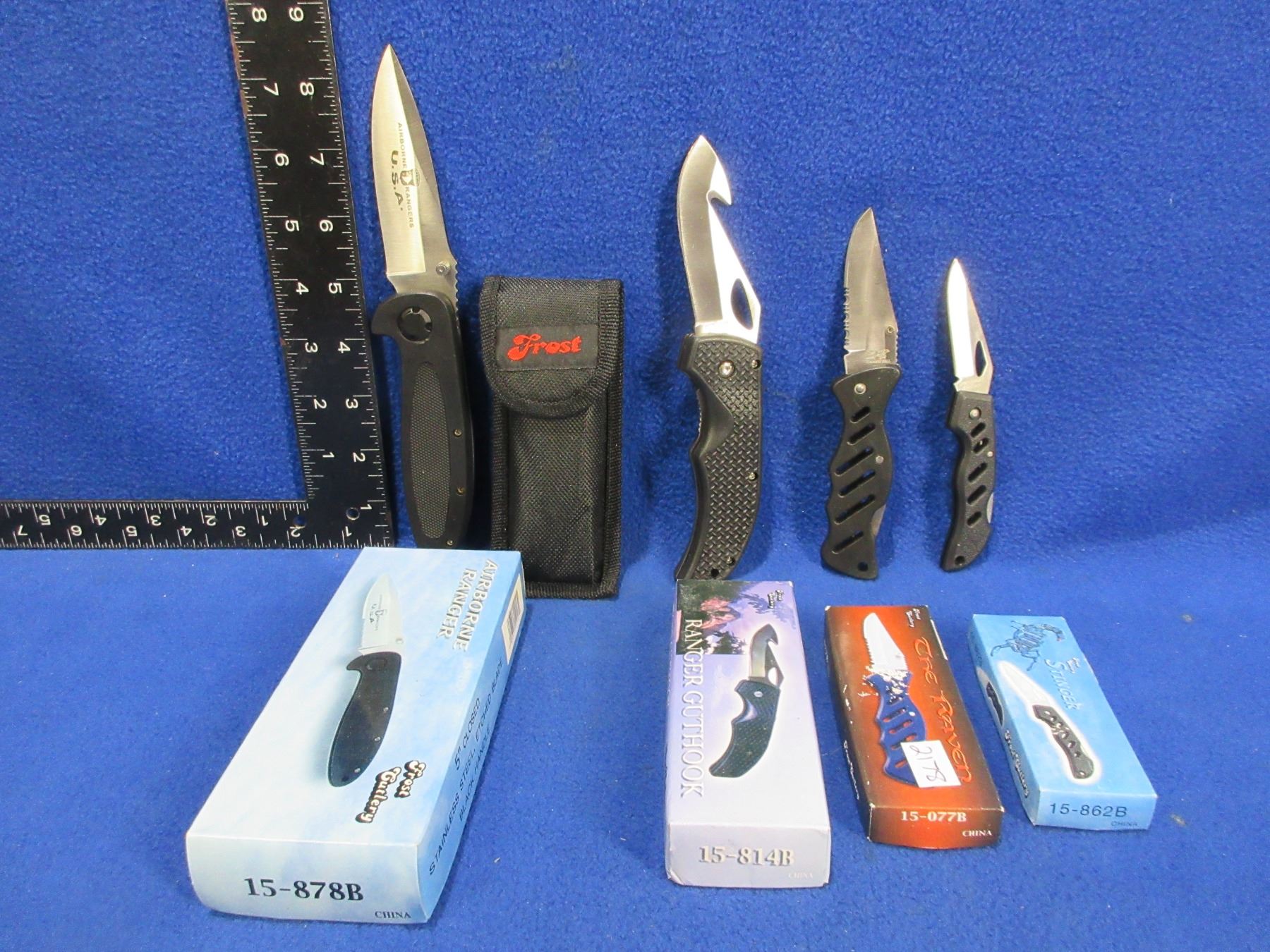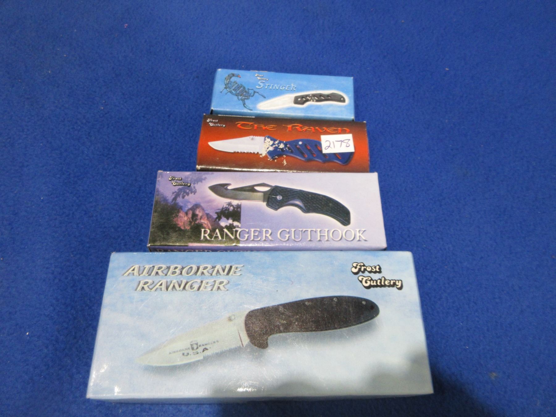 4 Folding Lock Blade Knives - Frost Cutlery - Appear Unused - Ranger Guthook, The Raven, Stinger, Airborne Ranger