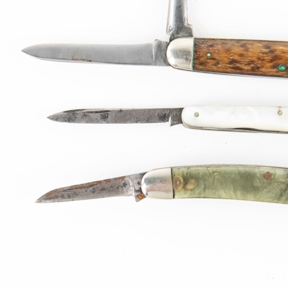 Here are 4-HSB ranging from a 2.75" closed MOP gent's knife, with a couple of cracks on pearl scales, blades are decent. Next is a 3-blade jack that has been sharpened, 3.00" closed, lazy sharpened blades. Then two more 3-blade serpentine jacks with pitting on the blades, one has chipped scale and both are 3.25" closed.