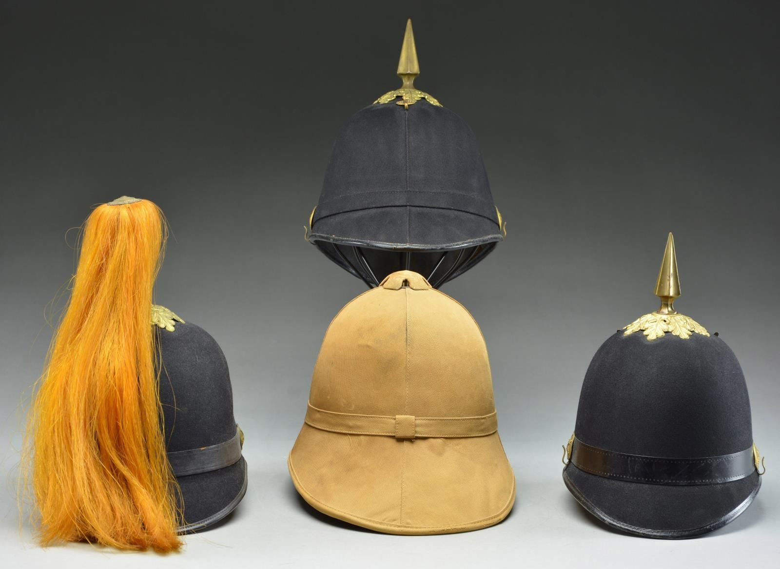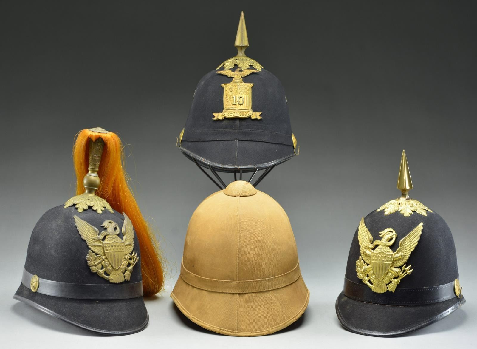 1) CAVALRY. An assembled M1881 cavalry helmet with an orange/yellow plume. The plume holder, base, eagle & side buttons all have a pleasing brass patina mixed with traces of original gilding. Although the aiguilette guides should be present, they have not been mounted on this helmet. CONDITION: helmet has a few dents to the body and is a bit dirty. 2) ARTILLERY. An assembled M1881 Artillery spike helmet. The spike, base, eagle & side buttons all have a pleasing patina with substantial original gilding remaining. The side buttons are incorrect for this helmet as they are for an officer’s model. CONDITION: helmet is quite strong and just a bit dirty. 3) NEW YORK. An enlisted grade 4-piece New York M1881 style spike helmet. The spike, base, side buttons & New York front plate all have a pleasing brass patina mixed with the remaining original gold finish. The interior has a Ridabock label along with several ink stamps. CONDITION: helmet is a bit worn but remains substantially strong. 4) PITH HELMET. A good example of an M1887 US sun helmet, otherwise known as a pith helmet. The body of the helmet is khaki colored canvas assembled in 4 major sections. The underside is green cotton with a brown leather sweatband. CONDITION: light to moderate overall wear. (02-19029/BF). $500-800.