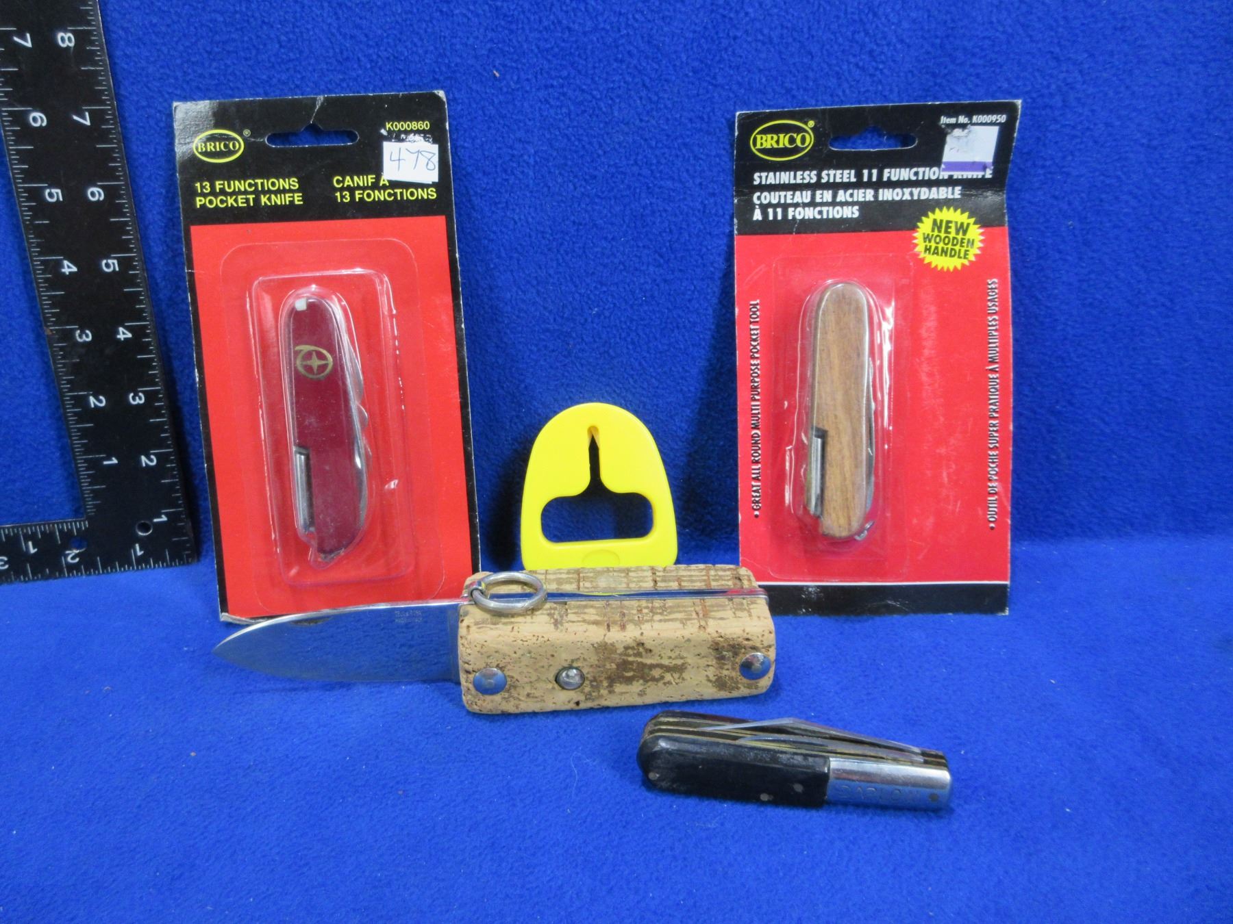 4 Knives and a Knife Sharpener - 2 Brico (New), Floating Cork Knife, Barlow and a Sharpener