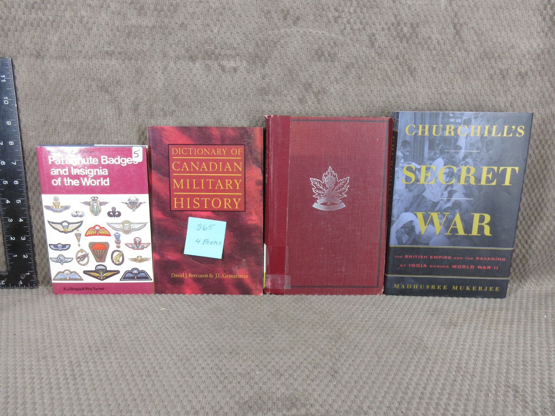 4 - Military Books - Parachute Badges and Insignia of the World by R.J. Bragg & Roy Turner, Dictionary of Canadian Military History by David J. Bercuson & J.L. Granatstein, History of the 2nd Battalion - C.E.F., Churchill's Secret Wary by Madhusree Mukerjee