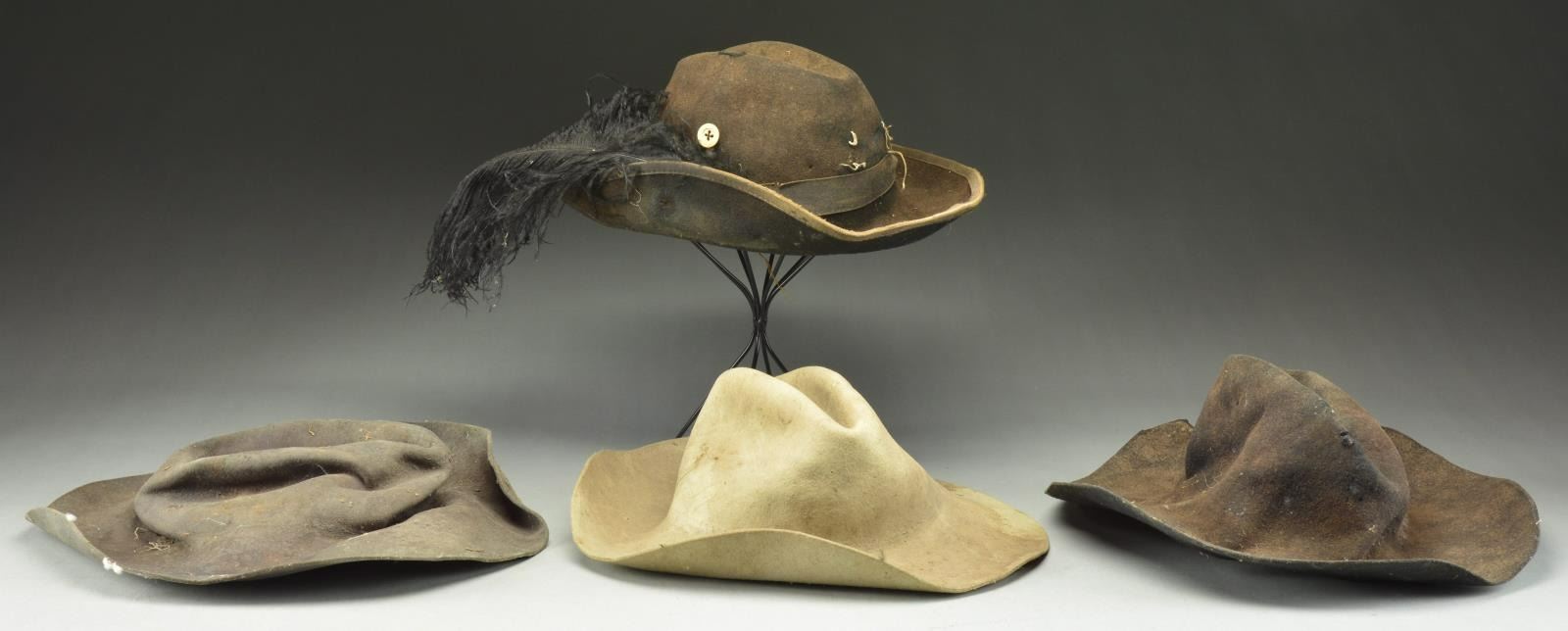 CENTURY. 1) A tan felt wide brim hat with no sweatband or hatband. CONDITION: hat has significant insect damage and discoloration throughout. The hat remains solid though heavily used. 2) A black or dark blue wide brim hat with no sweatband or hatband. CONDITION: hat shows significant wear with losses to the brim and breaks at the crown. The outside of the hat is significantly more faded than the underside. 3) A black or dark blue wide brim hat with no sweatband or hatband. CONDITION: hat has been crushed for many years and retains its flattened shape. Hat is extremely dirty with some insect damage and breaks in the crown. 4) A black or dark blue wide brim hat with grosgrain edging on the brim and a grosgrain hatband. There is a bone button sewn to the inside & outside of the right side of the hat. There is no sweatband, though the remains of stitching are present. A black ostrich feather has been mounted on the right side of the hat. CONDITION: the hat is extremely worn with fading primarily to the outside of the hat. There is visible damage from insect infestations and the grosgrain is faded & deteriorated. (02-17470/BF). $300-500.