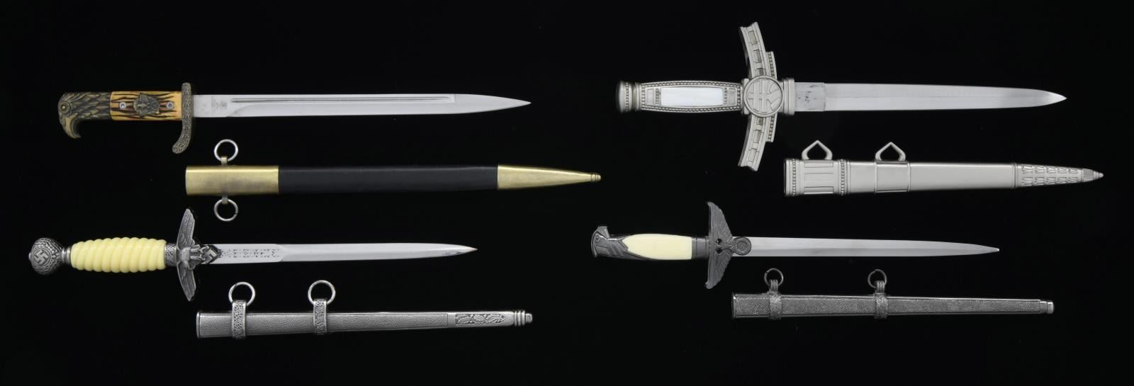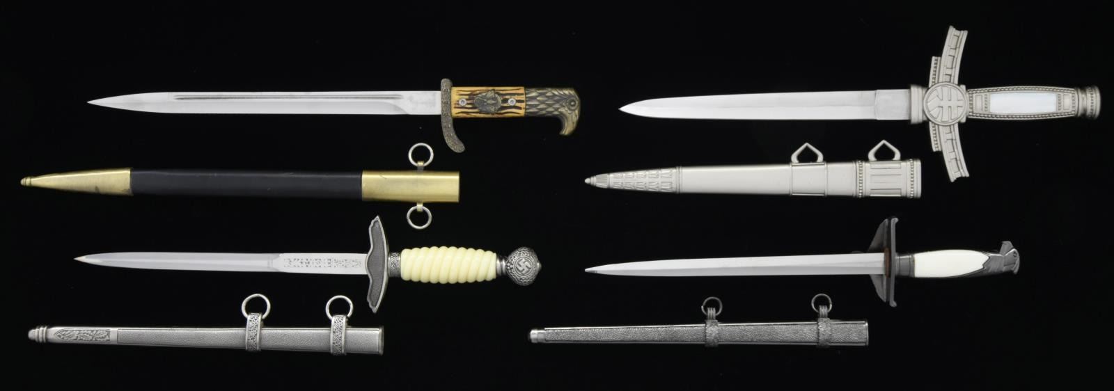 1) SLOVAKIAN. A Slovakian Air Force dagger measuring 17” in length. Blade has a raised medial ridge and is marked “STAINLESS CHINA” on the ricasso. Silver finished hilt with Slovakian cross in the center of the guard. Faux pearl 2-piece grip & silvered scabbard. CONDITION: unissued. 2) LUFTWAFFE. A WWII German Luftwaffe style dagger with an embellished blade and a mark that reads “STAINLESS CHINA”. Plated cross guard, pommel & scabbard. Crema colored plastic grip. CONDITION: unissued. 3) DIPLOMATIC. A WWII German Diplomatic style dagger. Blade has a raised medial ridge and is marked “STAINLESS CHINA” near the guard. Eagle embellished plated guard with plated eagle head pommel and 2-piece white plastic grip. Plated scabbard. CONDITION: unissued. 4) POLICE. A WWII German police dress dagger/bayonet. Bayonet has a single narrow fuller and is marked near the ricasso “(logo) BK1625 Stainless steel hand crafted in China”. Oak leaf embellished guard & eagle effigy pommel. 2-Piece faux horn grips with central police insignia. Gold plated mounts on a black faux leather covered scabbard. CONDITION: unissued. (02-19619/BF). $300-400.