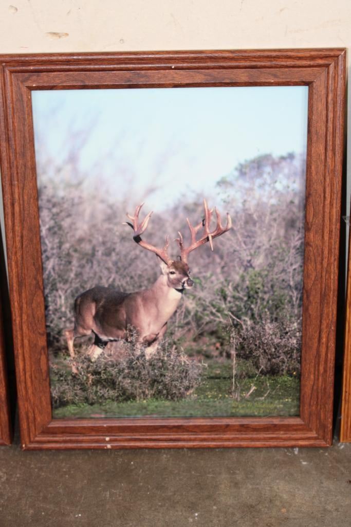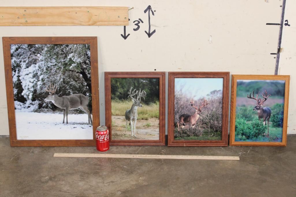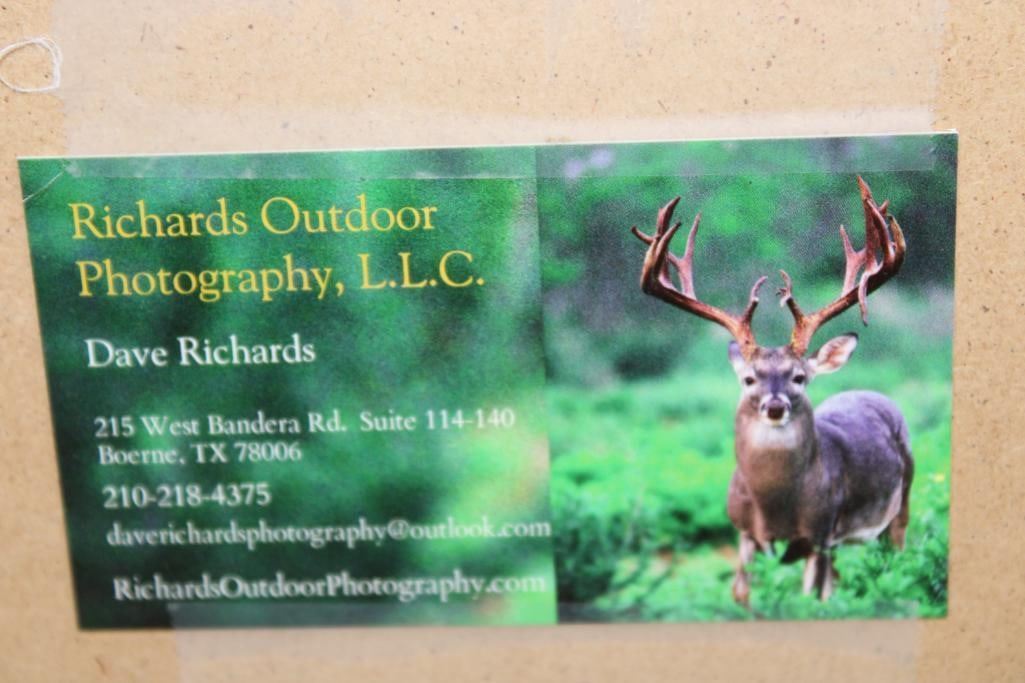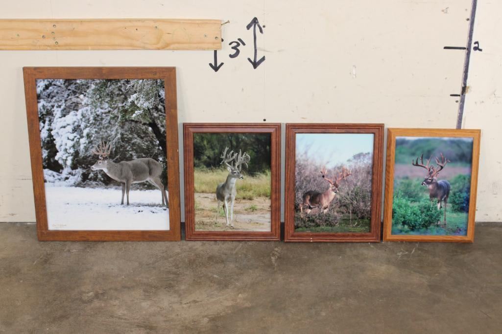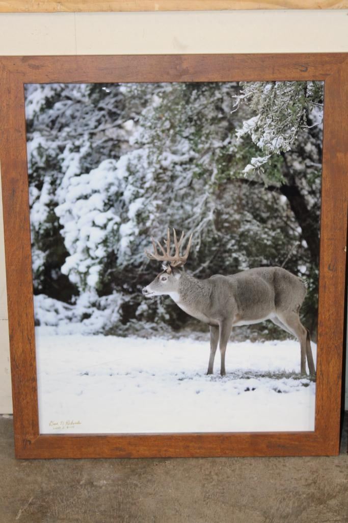 4 crisp images of Whitetail Deer Bucks signed Dave N. Richards. The largest photo measures 18" W x 22" Tall in a wood and glass frame signed "Dave N. Richards- Luke 2:8-14". The next photograph measures 14 3/8" Tall x 11 3/8" Wide signed "Dave N. Richards-Romans 15:13". The last two are in matching frames that measure 15" Tall x 12" Wide. They are signed "Dave N. Richards- Ephesians 2:4-10" and "Dave N. Richards- Ephesians 1:3-14. These 3 are also in glass and wood frames. (ONE$) COLLECTIBLE WILDLIFE PHOTOGRAPHY