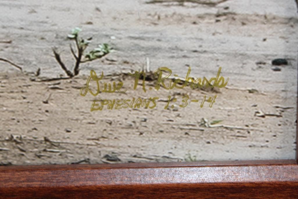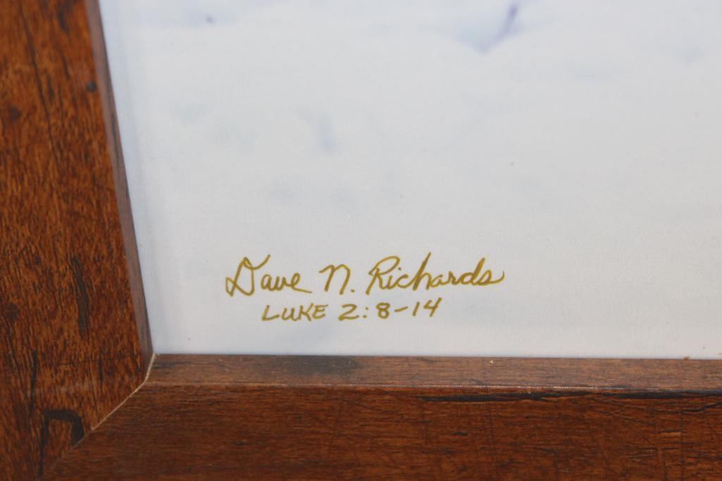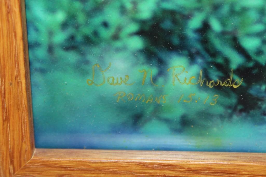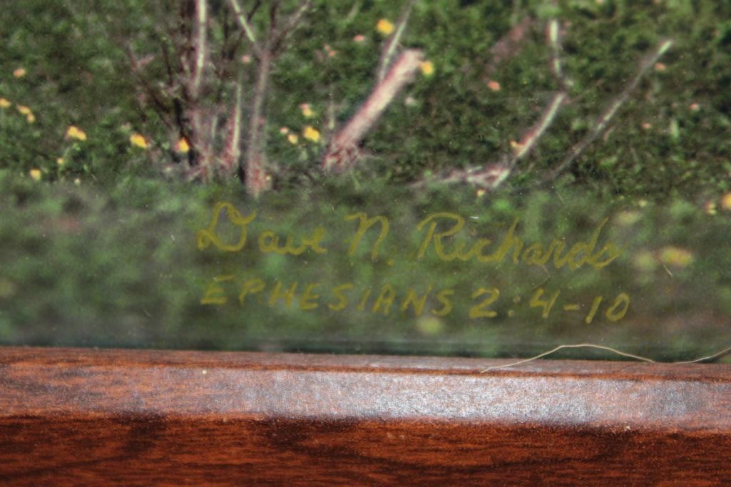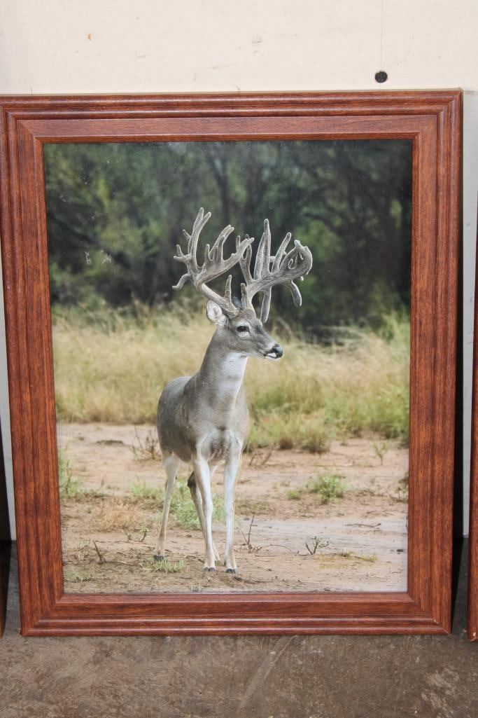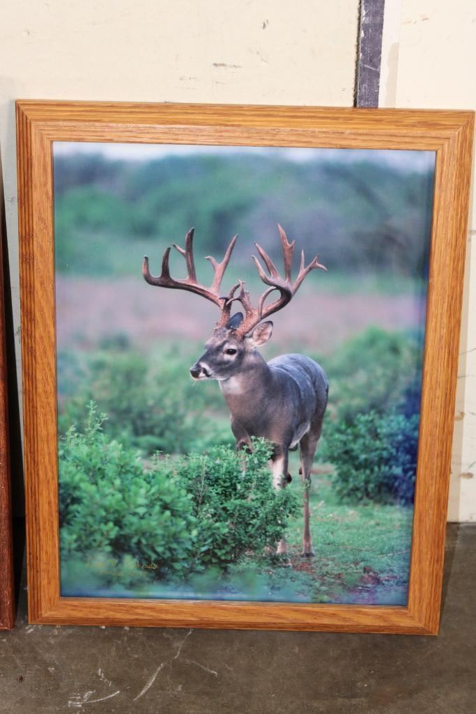 4 crisp images of Whitetail Deer Bucks signed Dave N. Richards. The largest photo measures 18" W x 22" Tall in a wood and glass frame signed "Dave N. Richards- Luke 2:8-14". The next photograph measures 14 3/8" Tall x 11 3/8" Wide signed "Dave N. Richards-Romans 15:13". The last two are in matching frames that measure 15" Tall x 12" Wide. They are signed "Dave N. Richards- Ephesians 2:4-10" and "Dave N. Richards- Ephesians 1:3-14. These 3 are also in glass and wood frames. (ONE$) COLLECTIBLE WILDLIFE PHOTOGRAPHY
