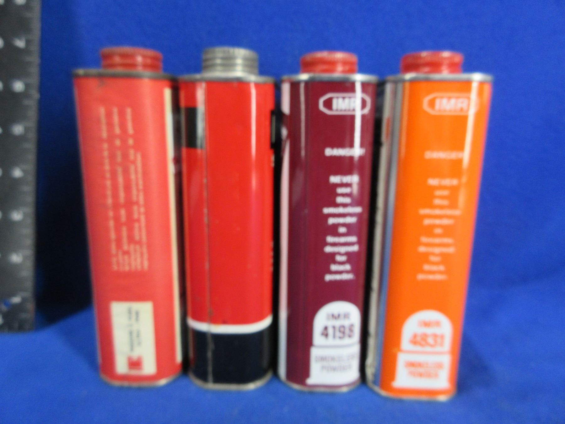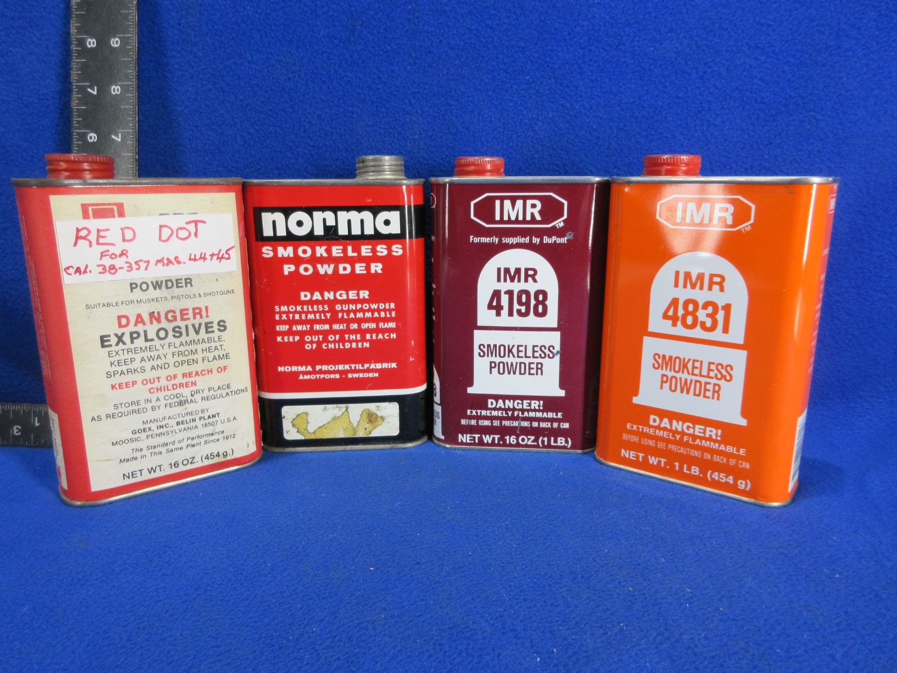 4 Tins of Assorted Powder - Norma (158 Grams), IMR 4198 (266 Grams), Red Dot (199 Grams), IMR 4831 (303 Grams) - Tin Weight Included in all Weights - PICK UP ONLY