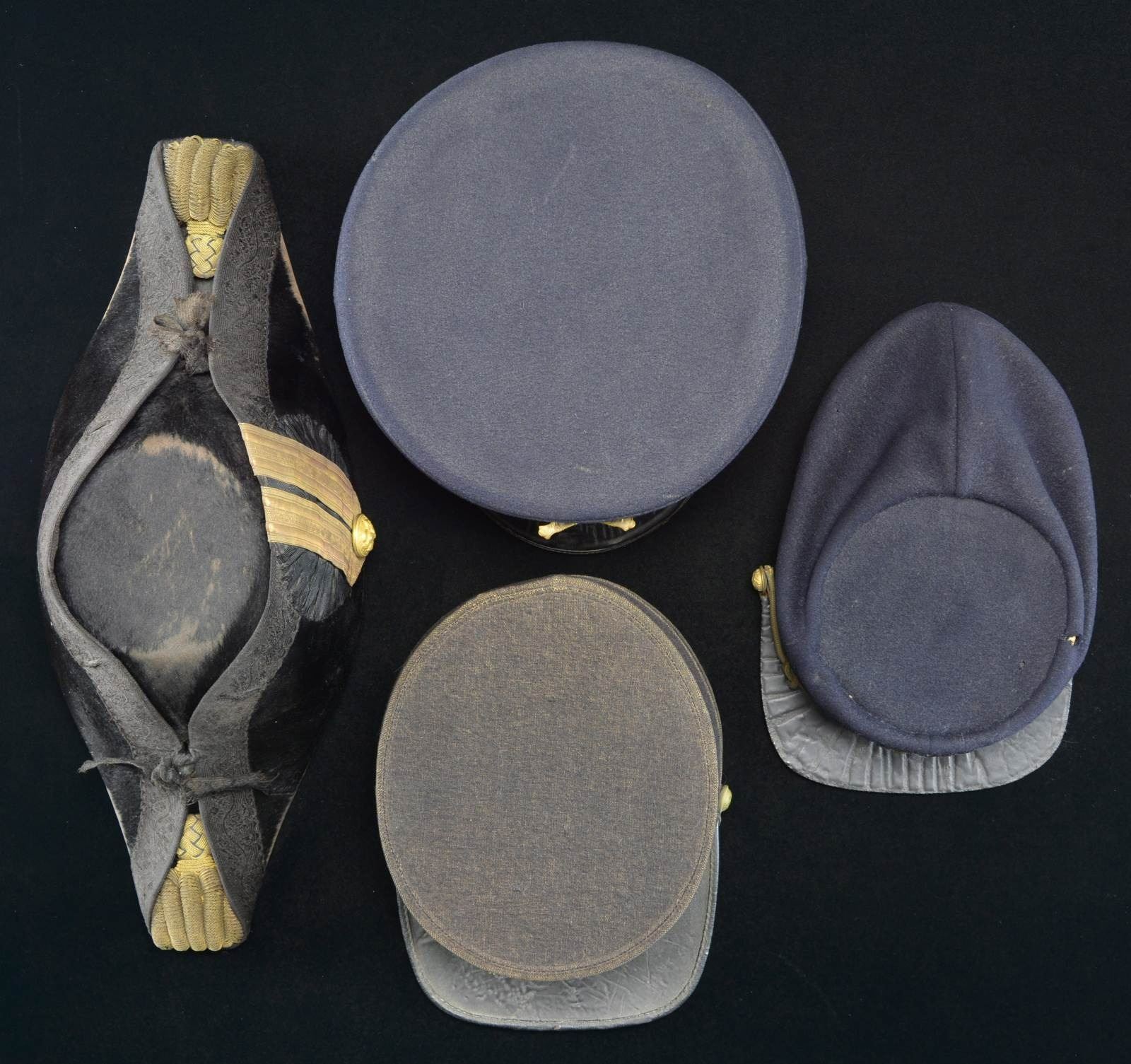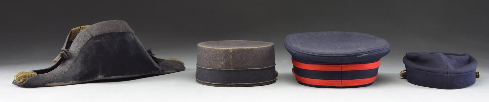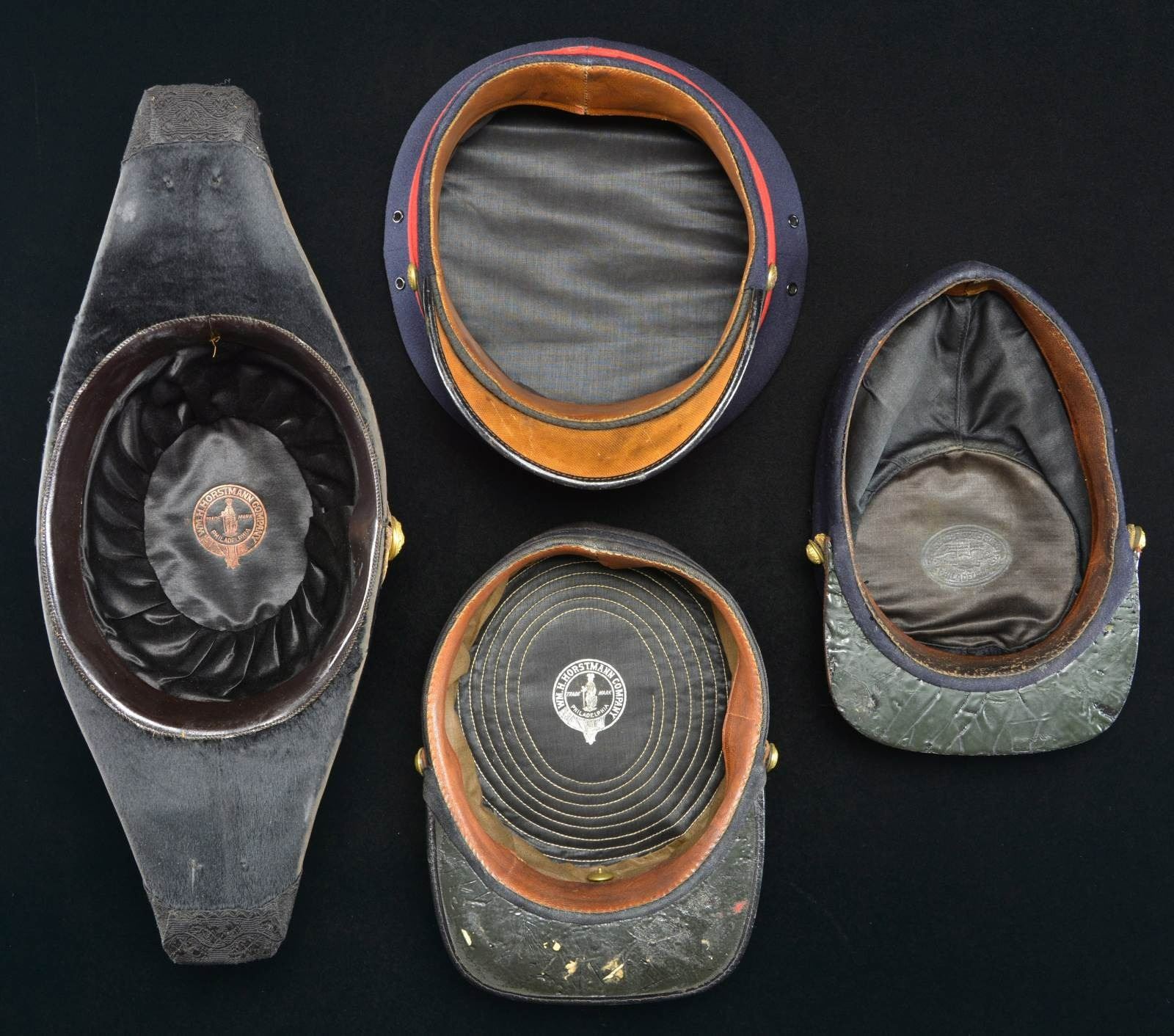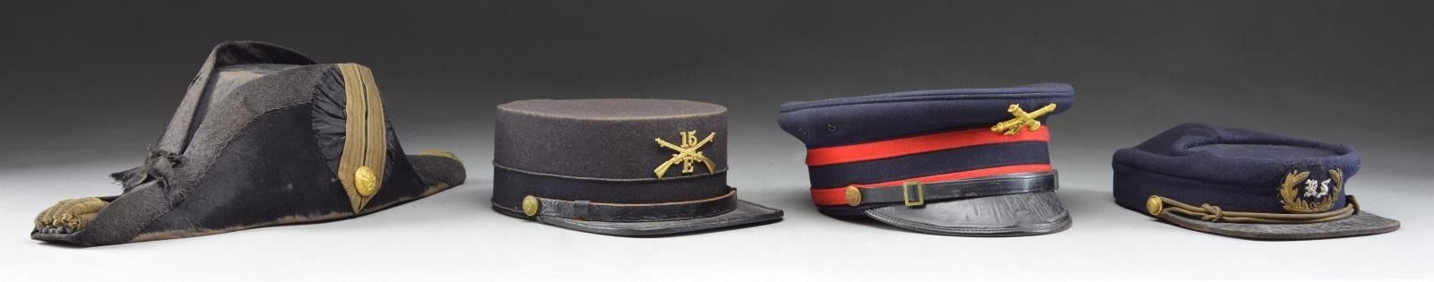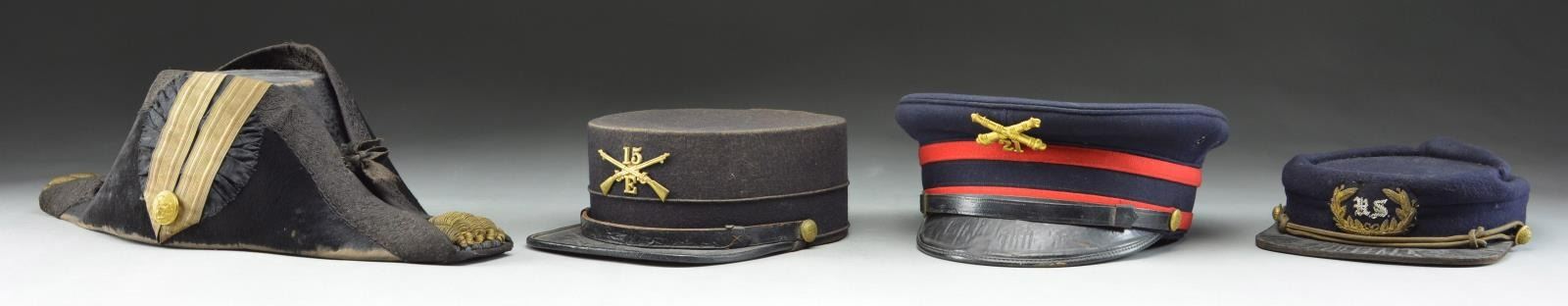 1) ARTILLERY. A nice example of a US M1902 Artillery visor cap. Cap has a blue crown with red & blue band. The front has a screw-back gilded brass crossed cannon with the number “21” below. Black leather chinstrap with M1903 side buttons. Black visor has a brown underside, and there is a brown leather sweatband. CONDITION: light wear overall with a little heat damage to the visor. 2) OFFICER. A fine example of a Spanish-American War era officer’s kepi with a dark blue crown with a gold & silver embroidered bullion “US” in wreath cap device on the front. Gold bullion cord chinstrap with “US” staff buttons on the side. Tarred leather visor with a brown sweatband. The black interior has an impressed label that reads “JACOB REED’S SONS FOUNDED 1824 (eagle) PHILADELPHIA”. CONDITION: there is scattered moth damage to the crown. The visor shows heat damage. 3) INFANTRY. A US M1895 style Infantry cap with a dark blue to black body featuring a gilded brass crossed rifle insignia on the front with the number “15” above and “E” below. Leather chinstrap with staff-like buttons on the sides. Tarred leather-bound visor with brown leather sweatband. The black interior lining is marked “WM.H. HORSTMANN COMPANY TRADE MARK PHILADELPHIA”. CONDITION: hat is in solid condition but shows light to moderate wear overall. 4) NAVY. A Spanish-American War period 2 WWI Naval fore & aft hat. Hat shows beaver construction with patterned black edging. There is a gold bullion tassel front & back with 1” gold tape trim on the left side framing a large Naval officer’s button. The interior label reads “WM.H. HORSTMANN COMPANY TRADE MARK PHILADELPHIA”. CONDITION: hat shows moderate wear with some loss of knap. (02-19028/BF). $400-600.