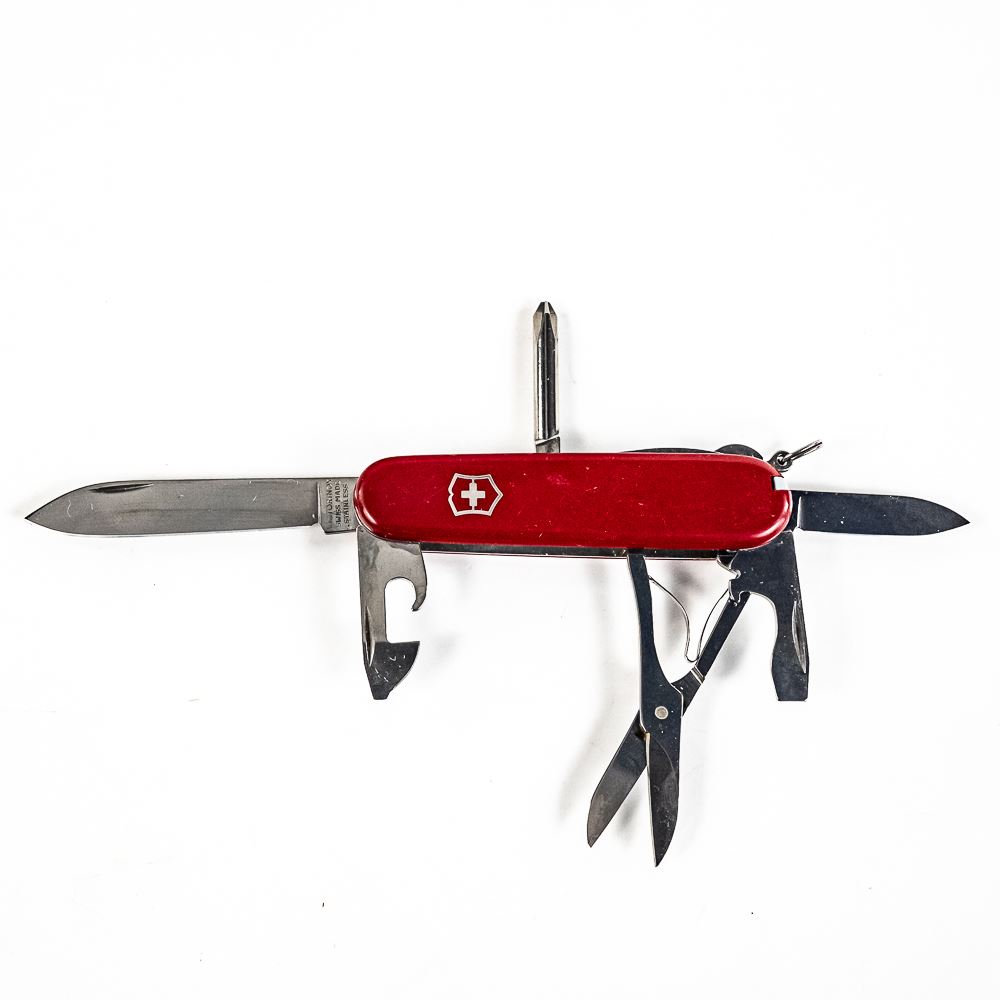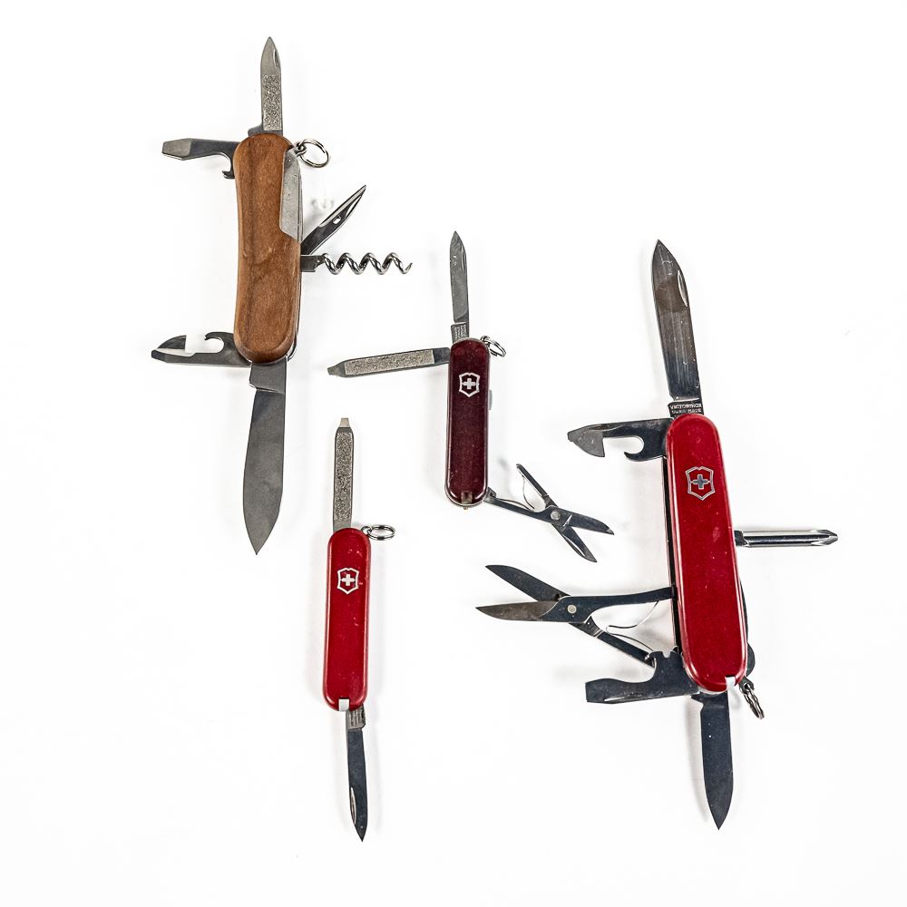 4 Victorinox Switzerland made Swiss Army Knives. 2small pen knife style, and 2 Officier Model knives. 3 knives are in very good to excellent used condition with only minor wear on handles and original edge still on blades, 1 small pen knife has handle damage and loose handles. Good reseller lot. 2.4-3.5" closed length. See photos.