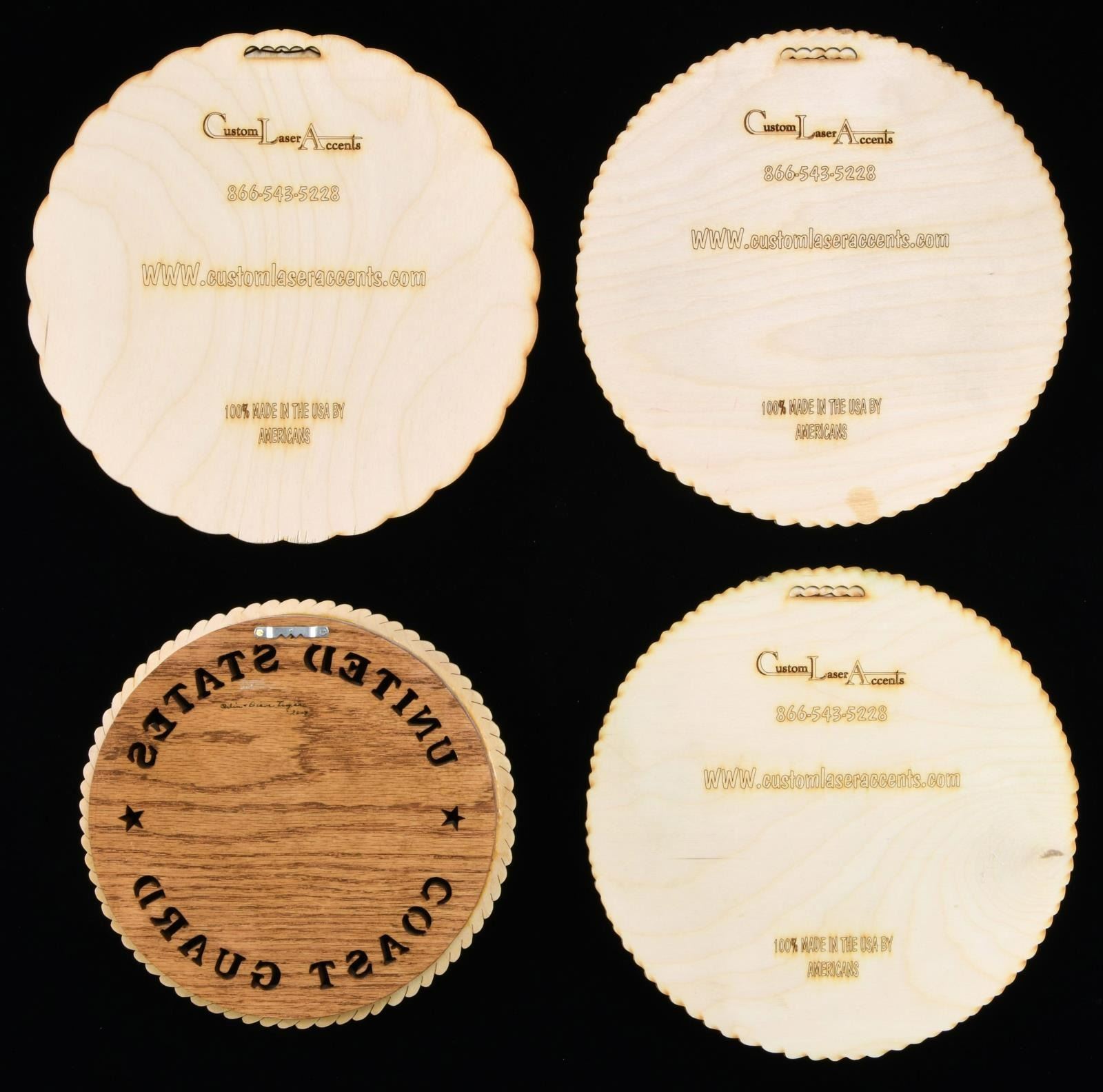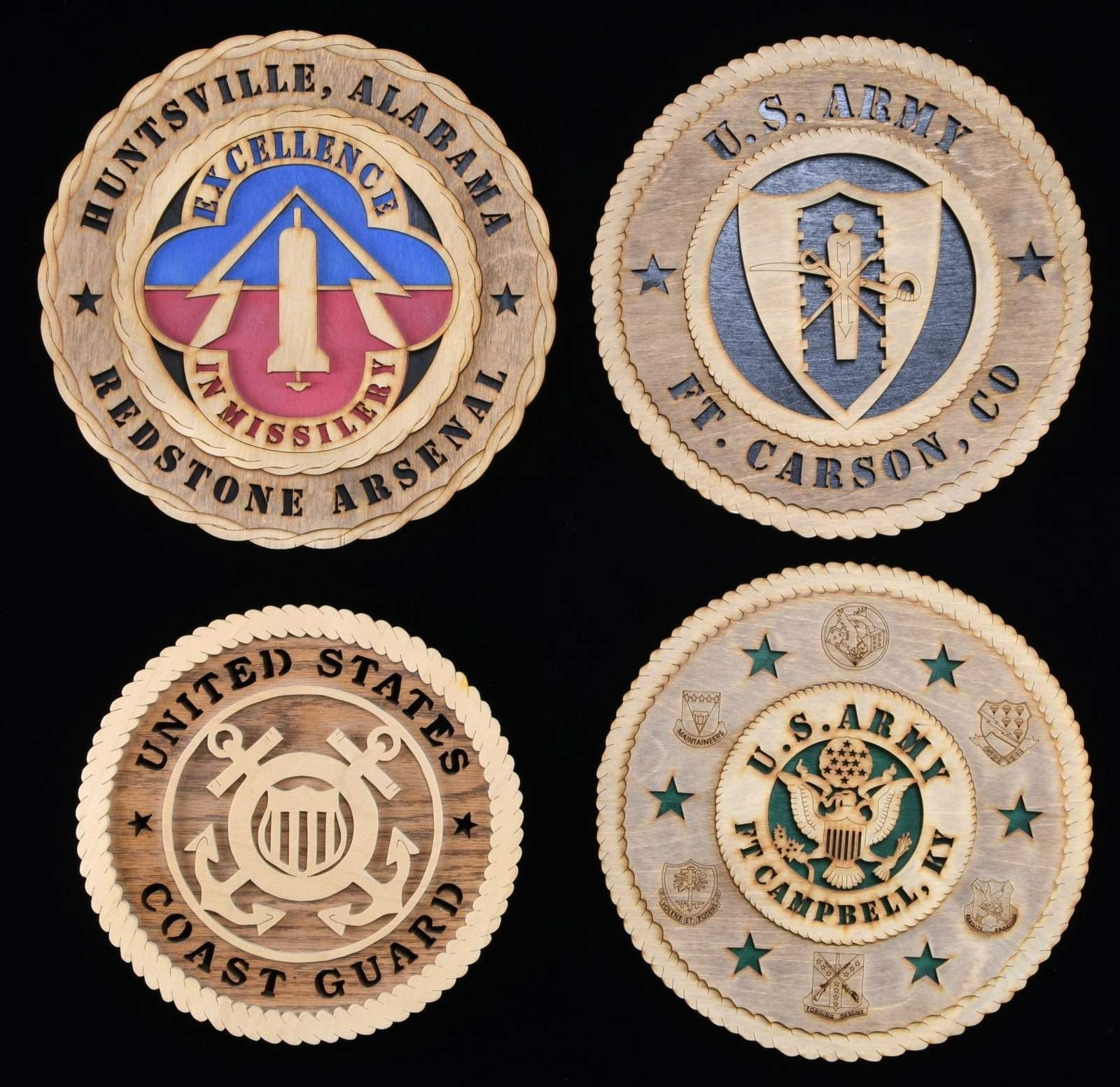 Each are approx. 11 1/2" in diameter. 1) United States Coast Guard. 2) US Army Ft. Campell, KY by Custom Laser Accents. 3) Redstone Arsenal Missile Defense by Custom Laser Accents. 4) US Army Ft. Carson, CO by Custom Laser Accents. CONDITION: near excellent overall. (02-19401/MD). $100-200.