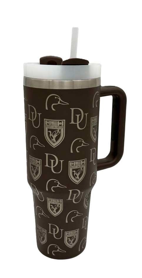 40oz Tumbler featuring the etched step repeat pattern featuring the duckhead, crest, and DU Logos. Stainless steel, double-walled insulated. Includes handle, lid and straw. Meets FDA requirements and is BPA free.