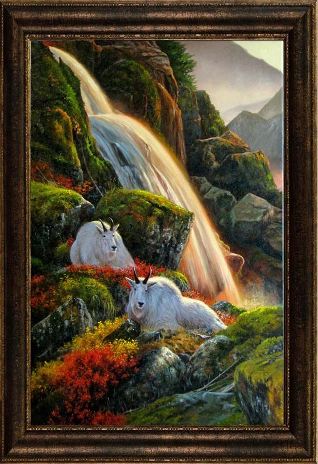 stretched cotton canvas of a pair of American mountain goats bedded