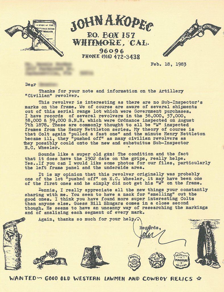 The frame was manufactured in 1877. According to the included factory letter it was re-inspected at the Colt factory on 29 January 1902 for Government issue (Artillery style, mixed numbers), and two 1983 Kopec letters suggest it was a surplus civilian frame in Colt's warehouse "pushed off" on the government during a transition between inspectors, likely Nettleton and Wheeler.