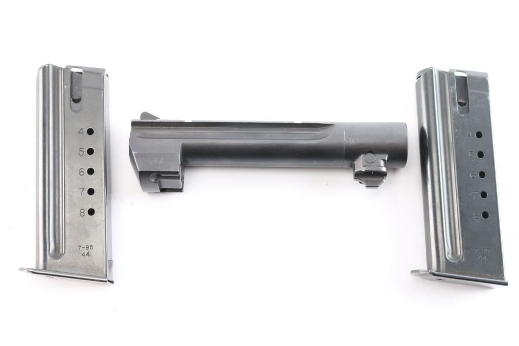 Includes 6" chrome lined barrel with dovetailed serrated front sight blade, two integral dovetails for sight/optics. Like new, bore and chamber are pristine. Two factory 8-rd magazines, like new.