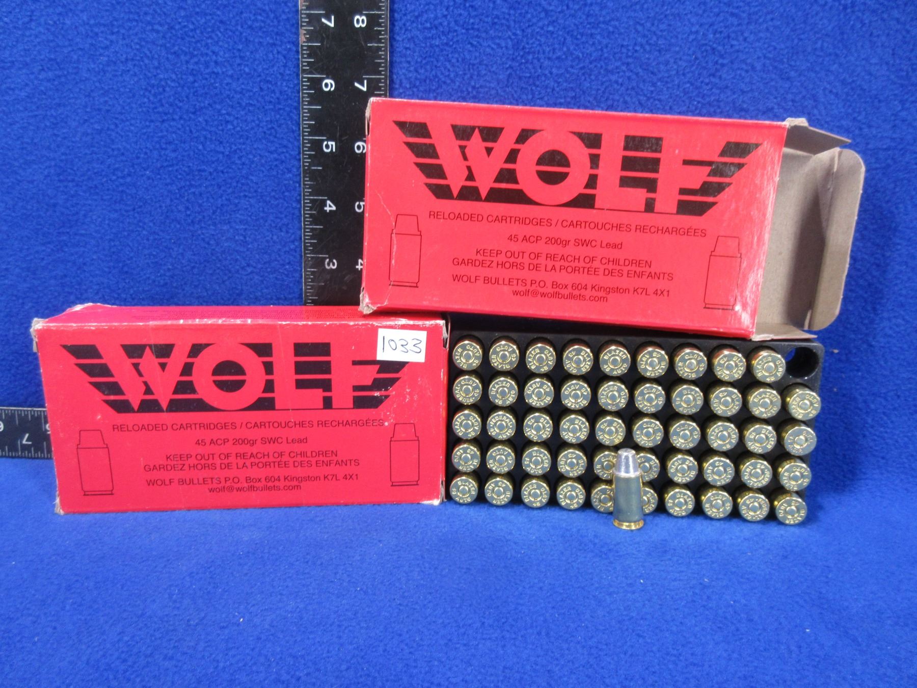 45 ACP 200gr SWC Lead Factory Reloads by Wolf - 2 Boxes of 50 - Must Ship Purolator