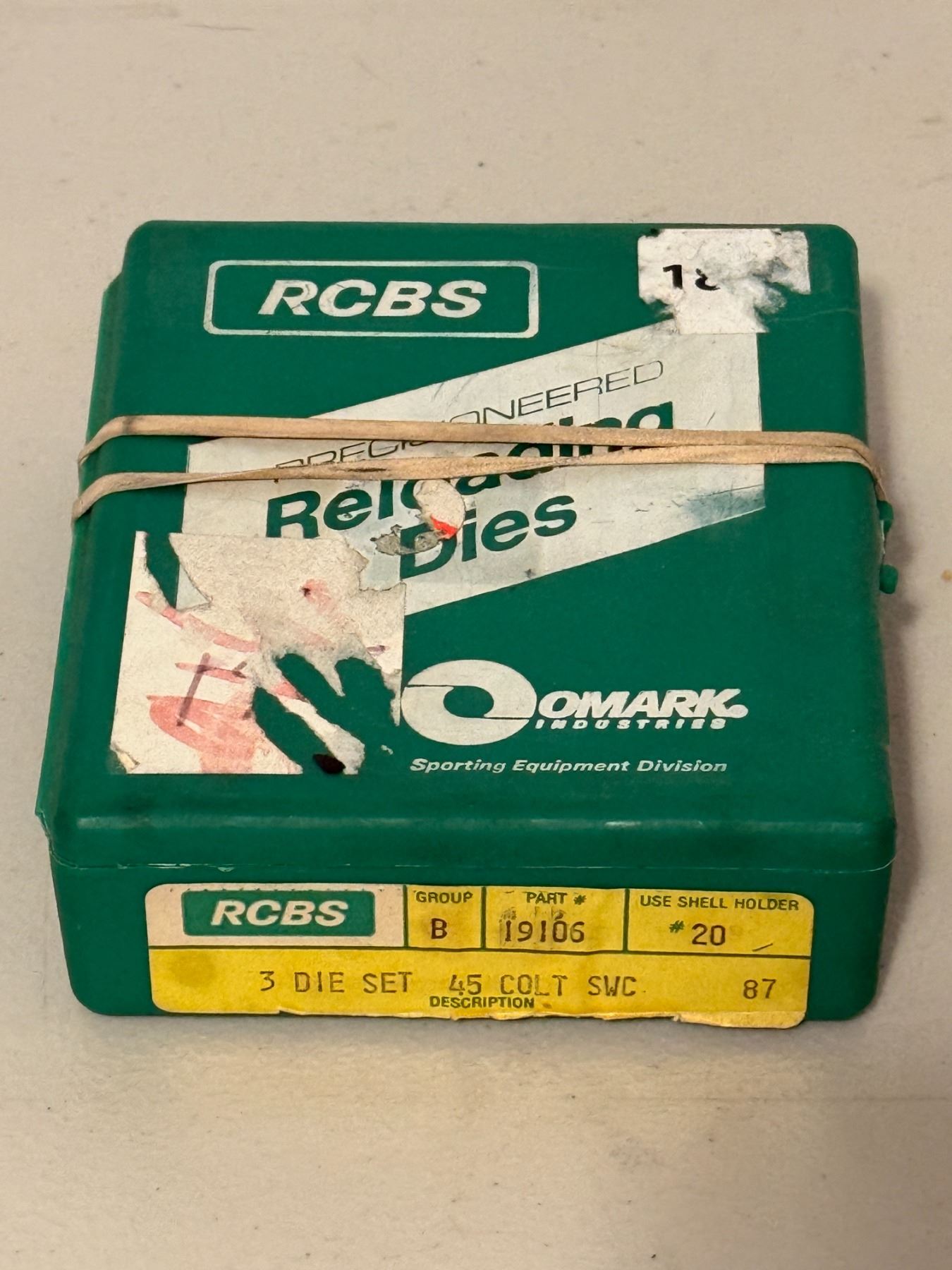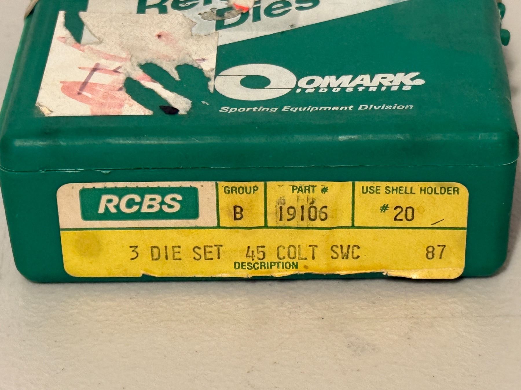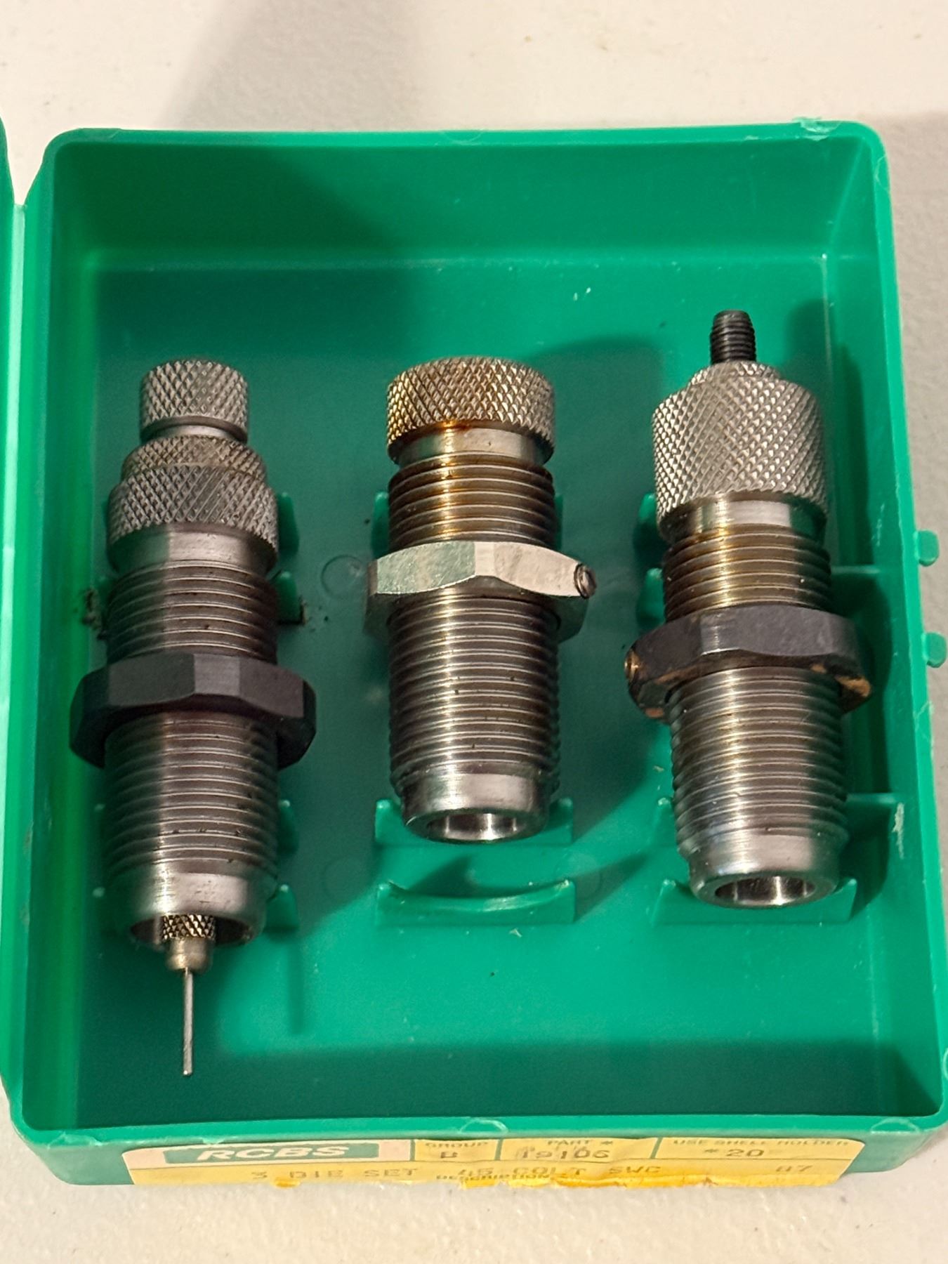 RCBS 3-die reloading set for .45 Colt; case lid closure is broken and does not latch.