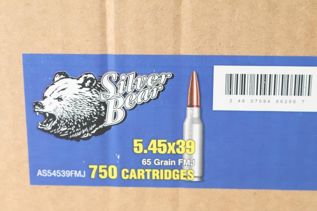 Approx. 750 rounds of 5.45 X 39mm ammunition. Russian made Silver Bear/Barnaul 65 Gr. FMJ steel case. In factory boxes, 1 case.