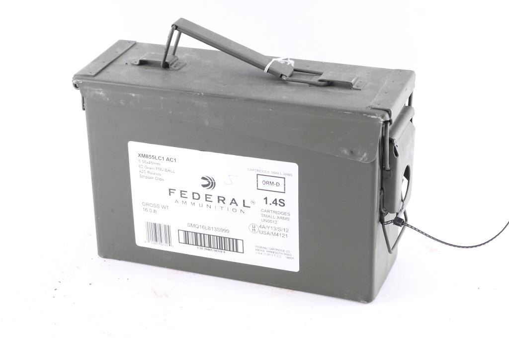 Approx. 420 rounds of 5.56 X 45mm factory new ammunition. Federal, 62 Gr. FMJ XM855LC1, 10 rd stripper clips, 3 clips per box, 14 boxes in 1 metal ammo can.