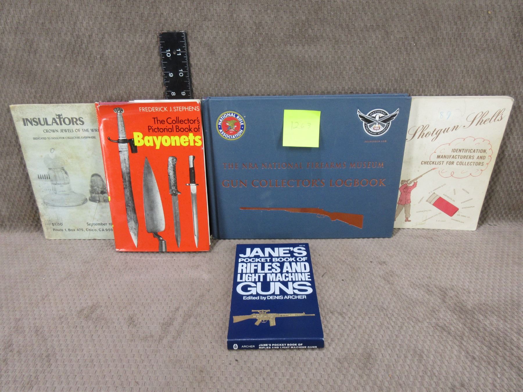 5 Assorted Gun Books - Janes Pocket Book of Rifles and Light Machine Guns, Insulators, Shotgun Shells, Bayonets, Gun Collectors Logbook