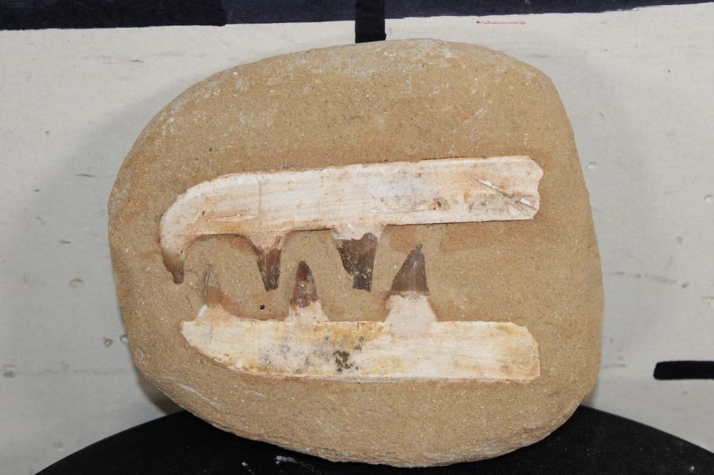 5 Authentic MOSASAUR TEETH Fossils in a Reproduction Jaw and Rock Matrix. It measures 7" Long x 6" Wide x 1.75" Thick and Weighs: 2 lbs 14 oz. Mosasaur teeth fossils are from the Late Cretaceous Period are are approximately 70 Million Years Old. ROCKS FOSSILS MINERALS