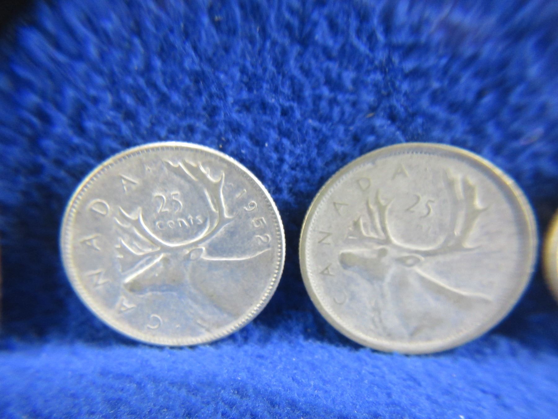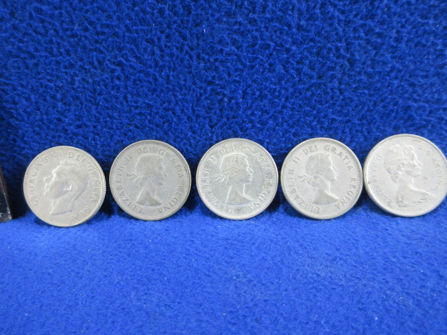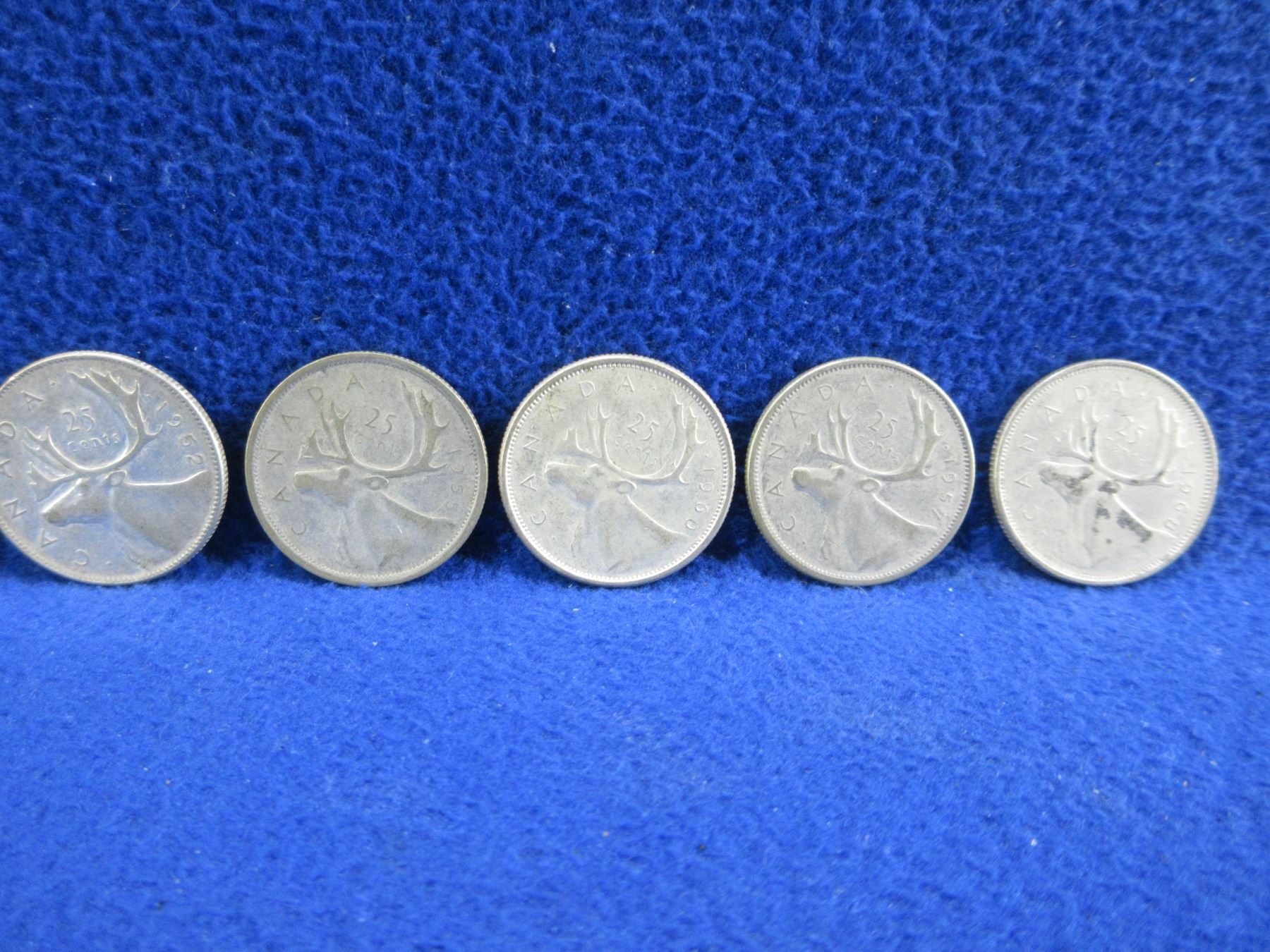 5 Canadian 25 Cent Coins - 1952, 1955, 1957, 1960 (.800 Silver), 1968 (.500 Silver)