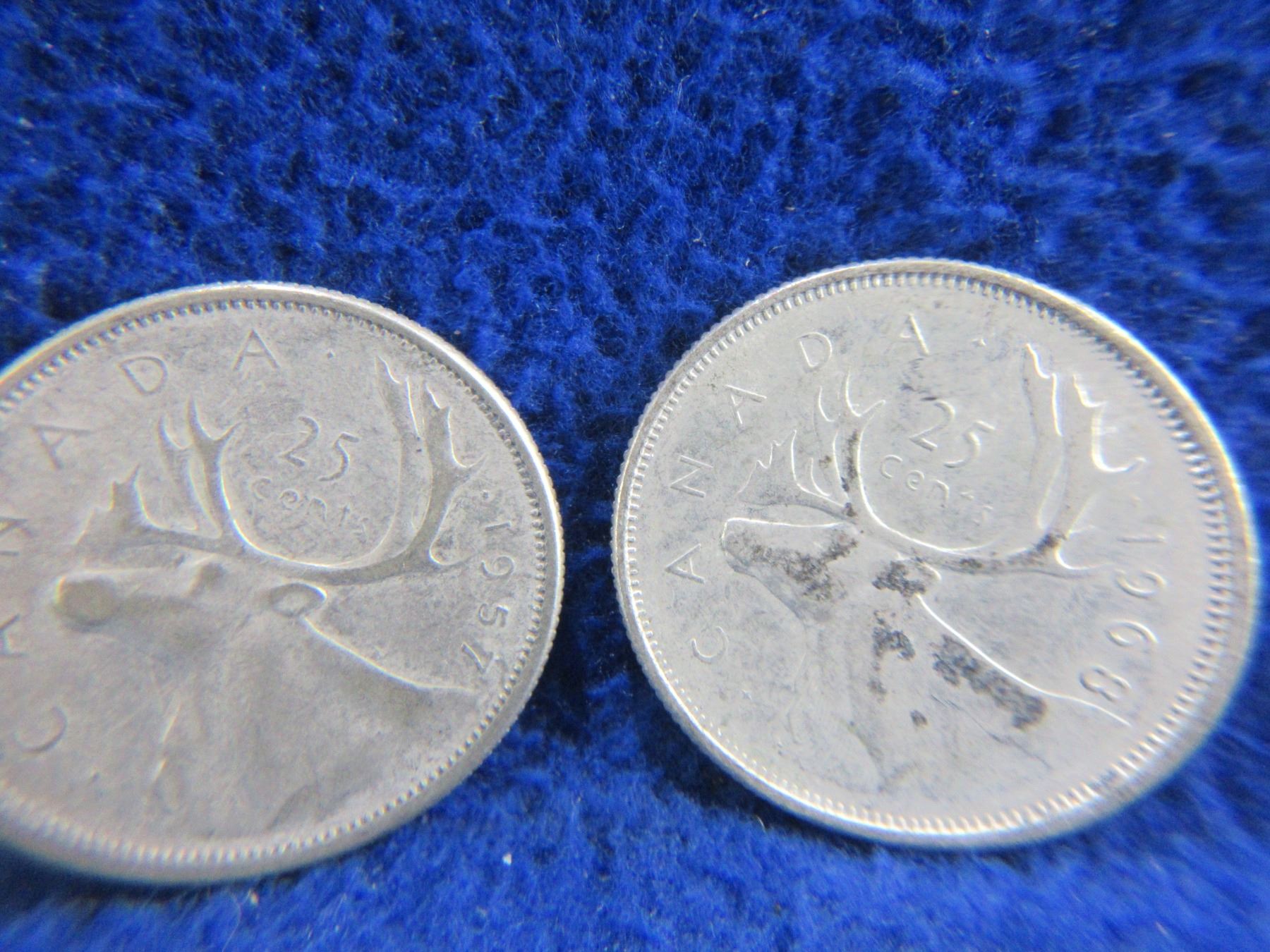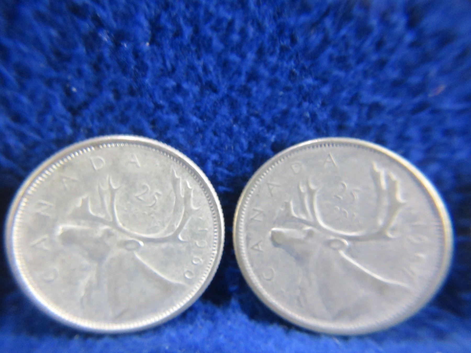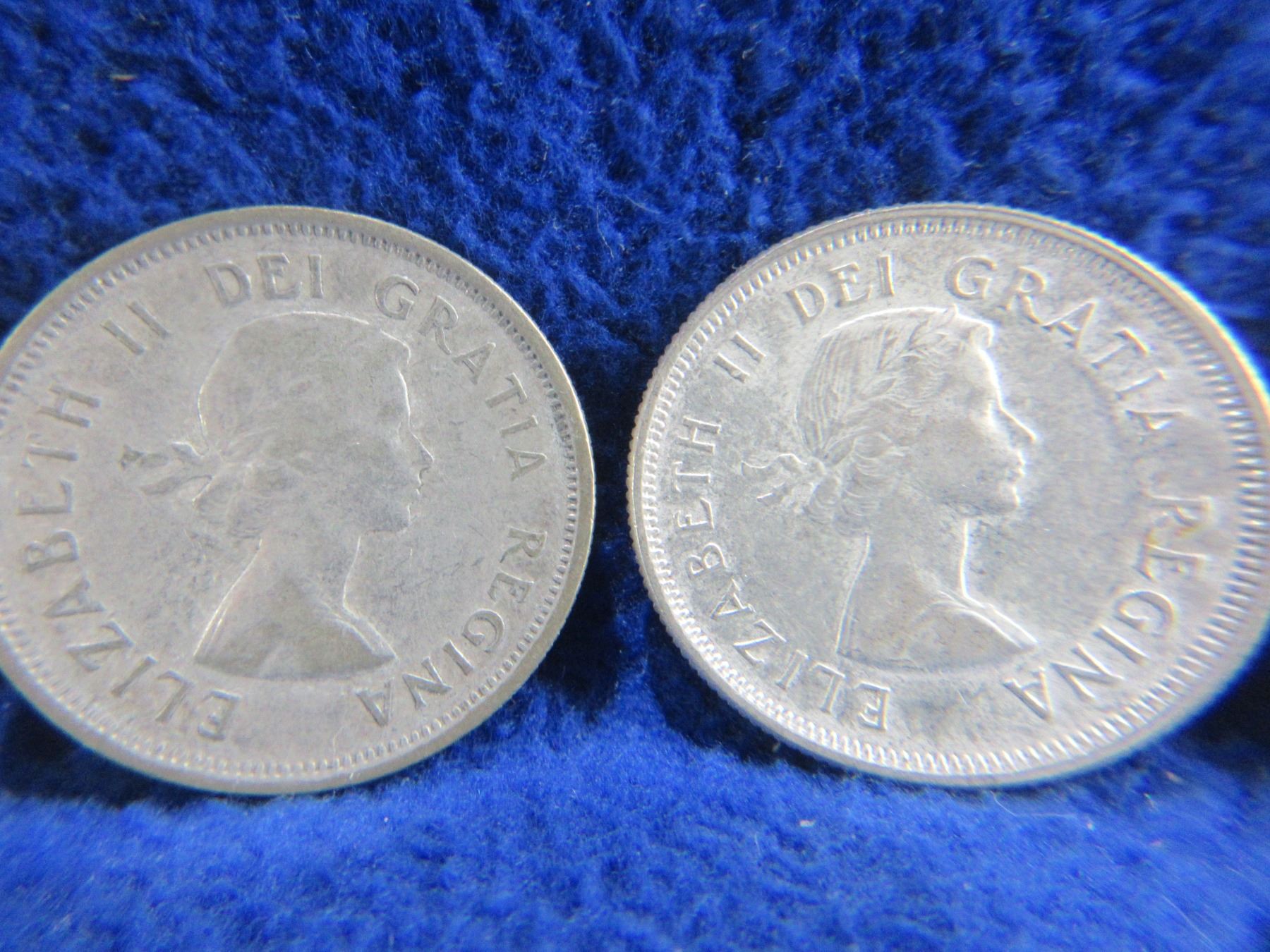5 Canadian 25 Cent Coins - 1952, 1955, 1957, 1960 (.800 Silver), 1968 (.500 Silver)
