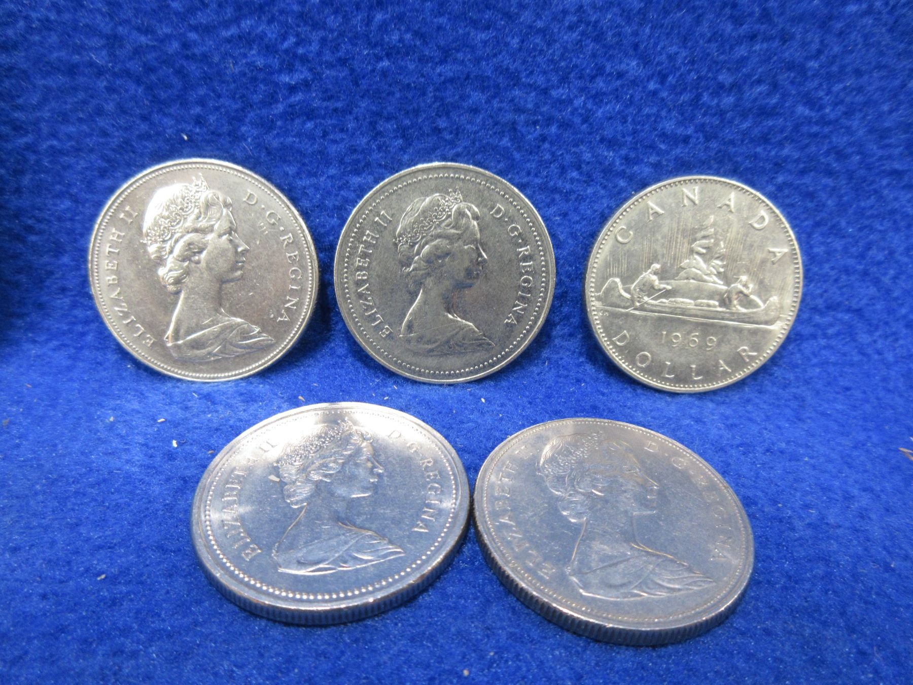 5 Canadian Dollar Coins - 1968, 1969, 1970, 1973, 1978