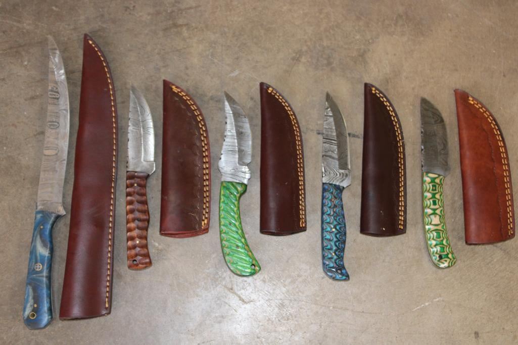 5 Damascus Steel KNIVES with Leather Sheaths. There is 1 Big Filet Knife and 4 Fixed Blade Knives. They all have colorful Wood or Resin Handles and their own Leather Sheath. (ONE$) FISHING AND HUNTING KNIVES AND BLADES