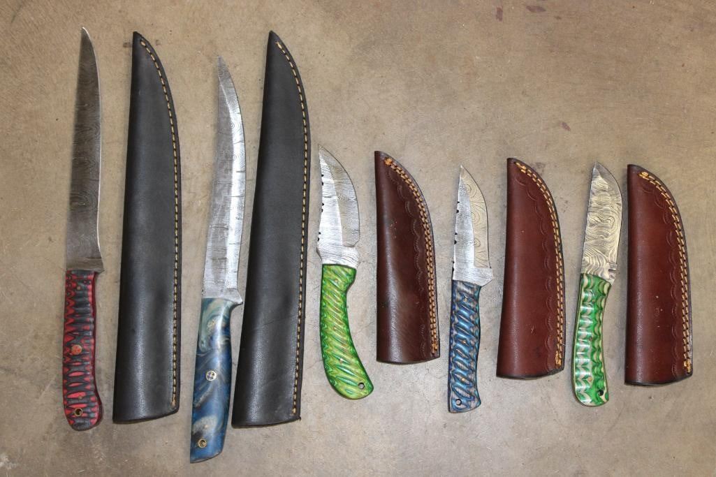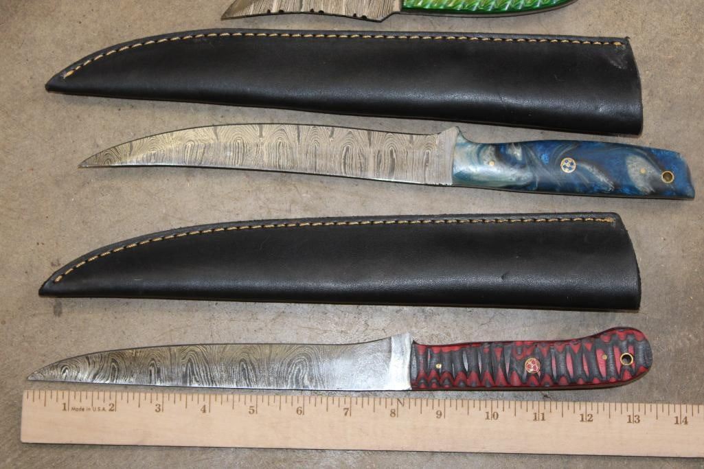 5 Damascus Steel KNIVES. There are 2 Big Filet Knives and 3 Fixed Blade Knives. They all have colorful Wood or Resin Handles and come with thier own Leather Sheaths. (ONE$) FISHING AND HUNTING KNIVES AND BLADES
