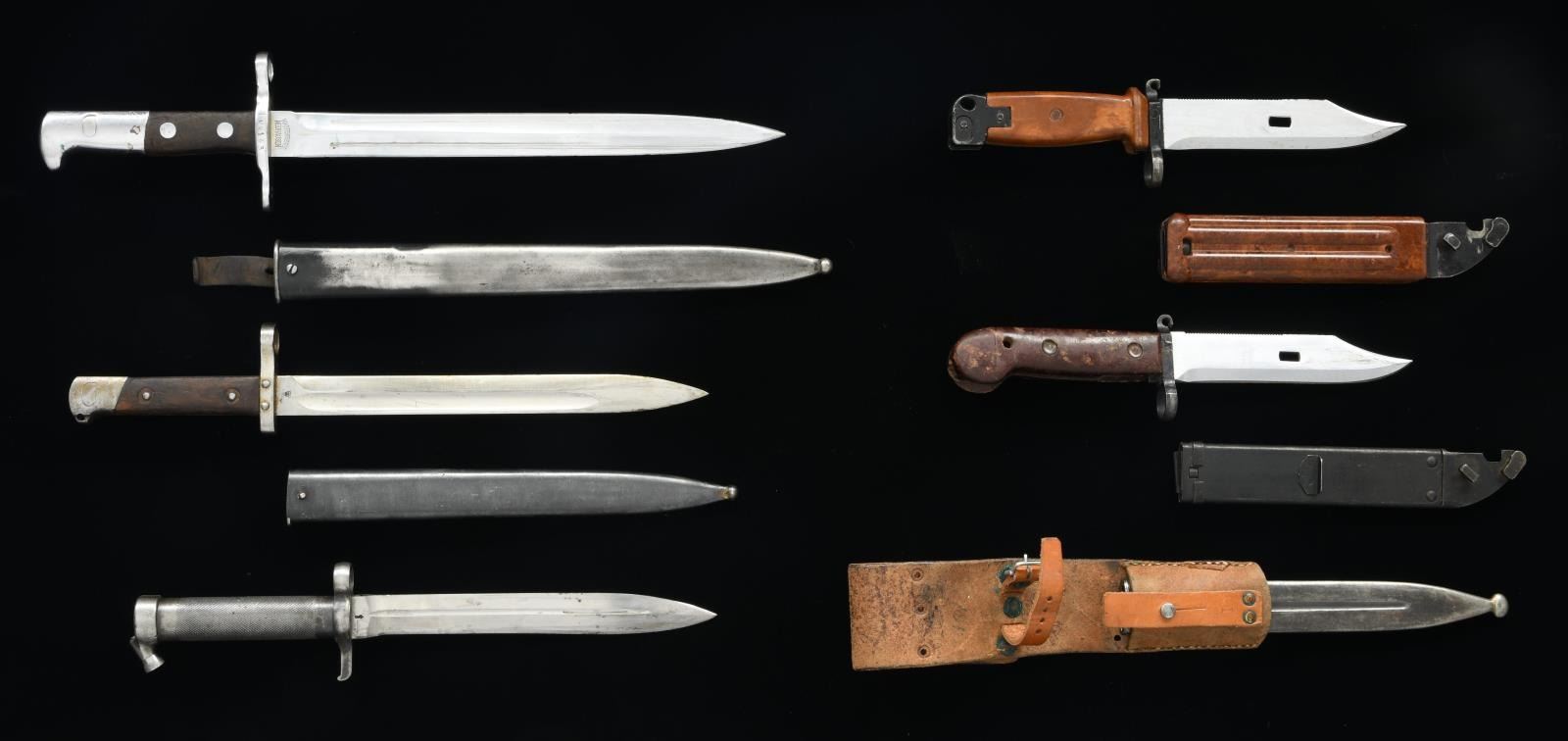 1) AKM TYPE I BAYONET WITH SCABBARD. CONDITION: very good w/ light marks. 2) RUSSIAN AKM TYPE II WITH SCABBARD. CONDITION: good. 3) AUSTRIAN STEYR MODEL 95 BAYONET WITH SCABBARD. S# 6570. CONDITION: very good w/ impressions to grip & light patina throughout. 4) SWISS WAFFENFABRIK NEUHAUSEN MODEL 1918 BAYONET & SCABBARD. CONDITION: bayonet good overall showing a few knicks in edge & gouges in grip. Good scabbard shows finish loss & light marks. 5) SWEDISH ESKILSTUNA JERNMANUFACTUR AB MODEL 1896 BAYONET & SCABBARD. S# 580.Unit marked "L / I25 No 1a No 618". CONDITION: blade in good condition showing sharpened edge, patina & verdigris. Brown leather frog shows verdigris in rivets. Scabbard in good condition w/ faded finish. (02-19795/MD). $300-500.
