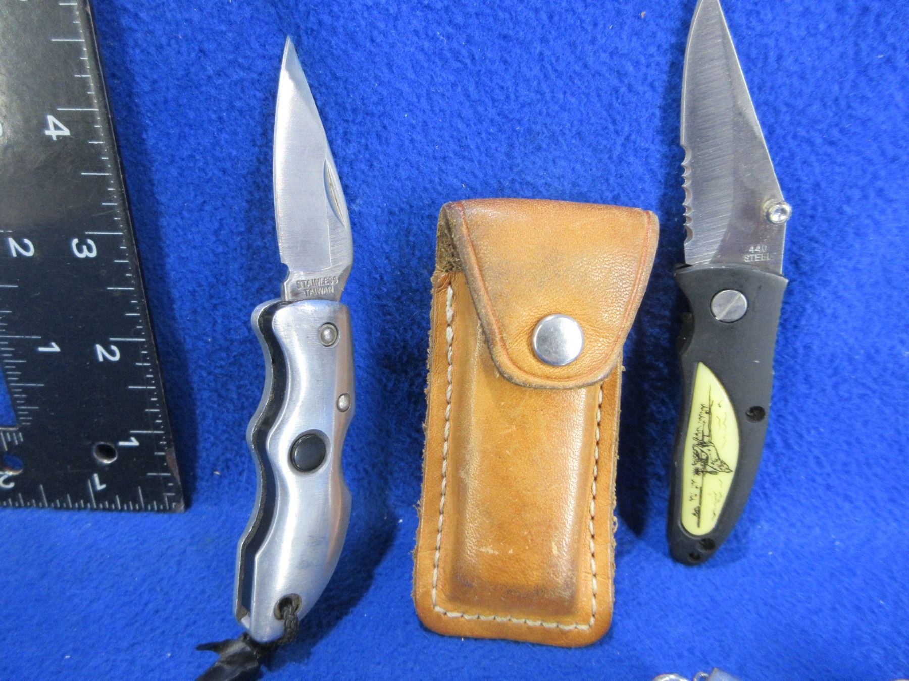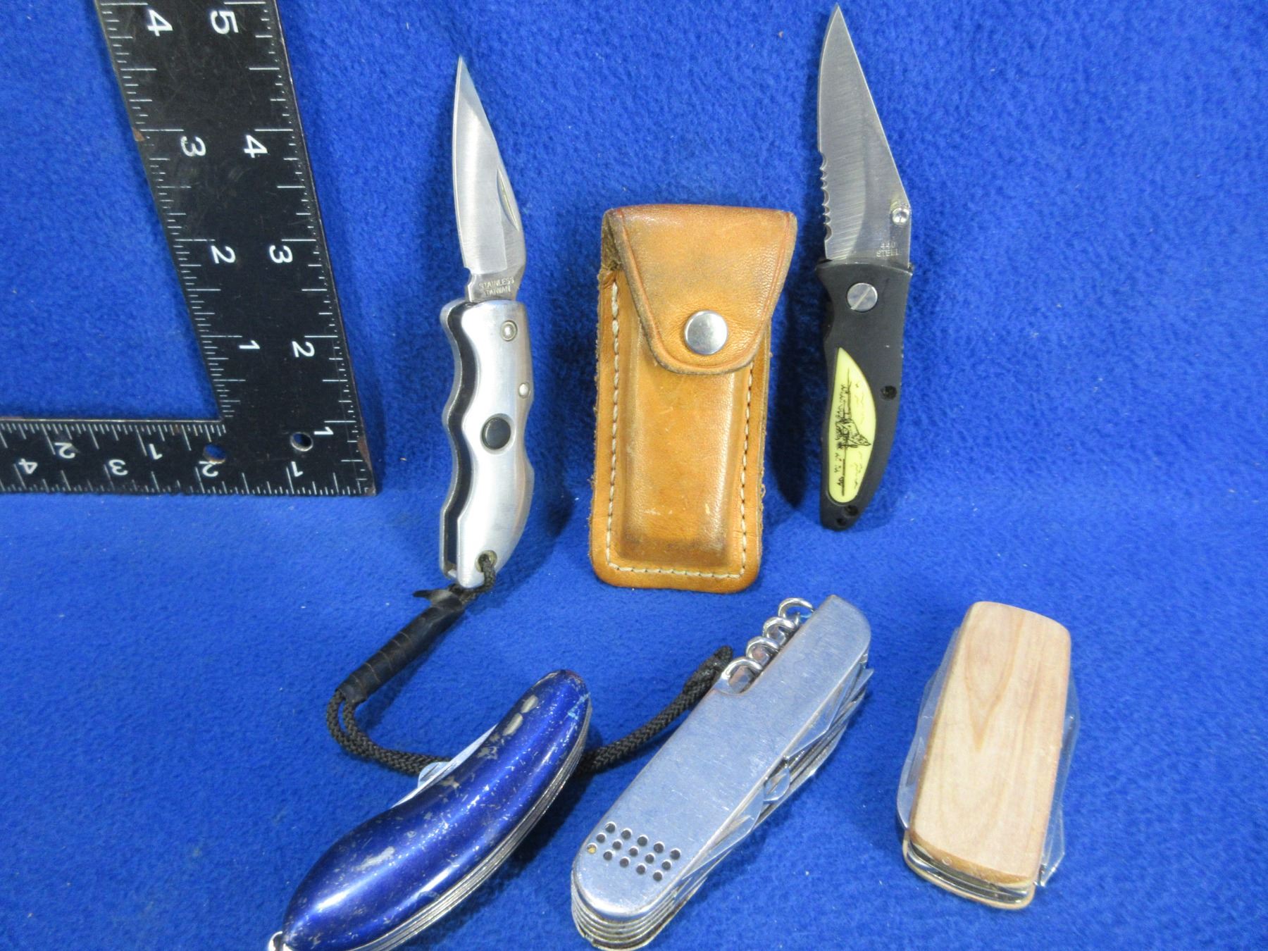 5 Folding Pocket Knives - 1 has a Leather Sheath