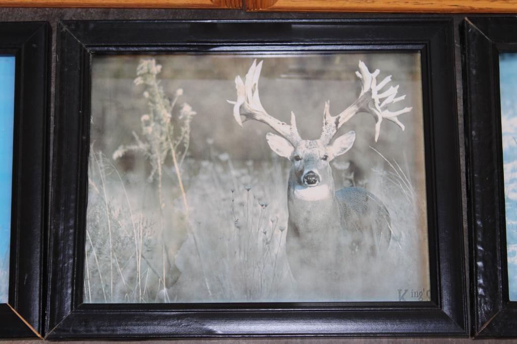5 Framed MULE DEER Photo Prints. There are 2 larger Mule Deer photos in nice 21" Wide x 17.25" Tall wood and glass frame. 3 Framed photos of Mule Deer in 12" Tall x 15" Wide frames (the frames have moisture damage). (ONE$) DECORATIVE WILDLIFE ART
