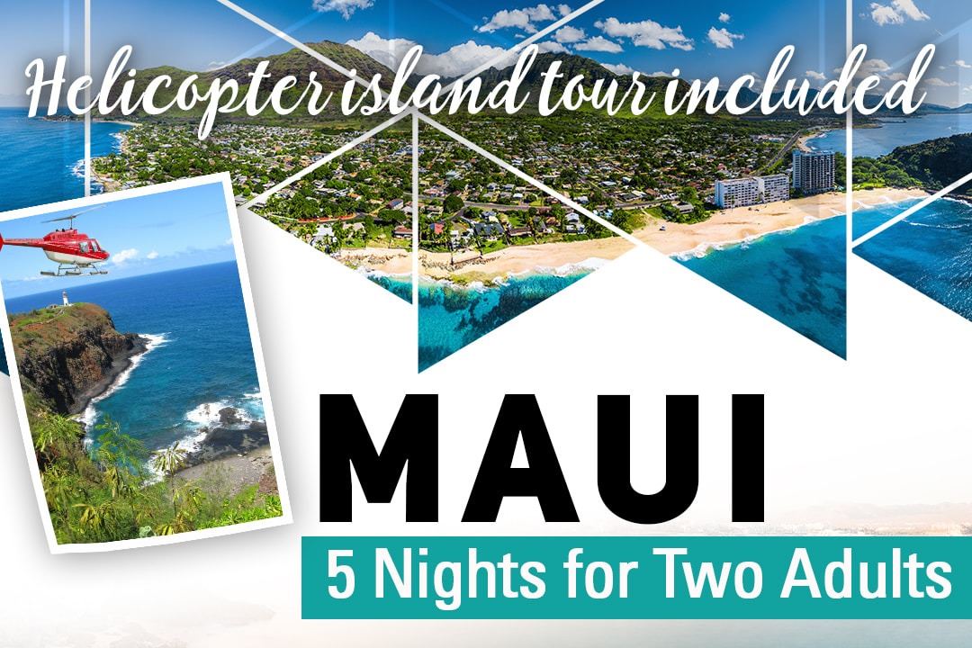 6 days, 5 nights in Maui for 2 adults at one of many Hotels in Kaanapali. This trip includes a 75 minute helicoptor ride for 2 to the Hana Rainforest. Valid for 2 years from purchase