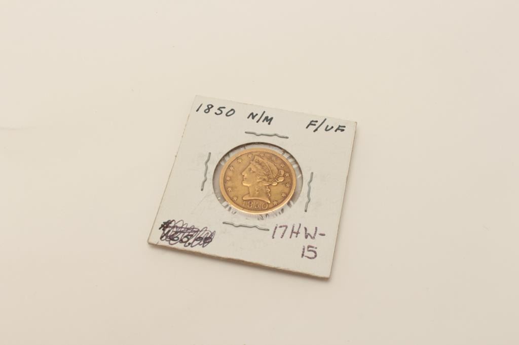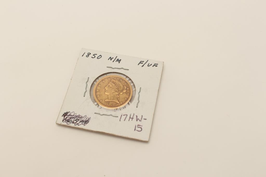 $5 U.S. gold dated 1850 (No motto) V.F. Not professionally graded. Old collector’s horde. $200-$400