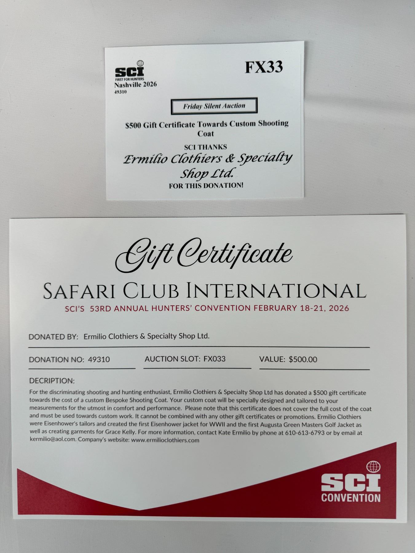 For the discriminating shooting and hunting enthusiast, Ermilio Clothiers & Specialty Shop Ltd has donated a $500 gift certificate towards the cost of a custom Bespoke Shooting Coat.