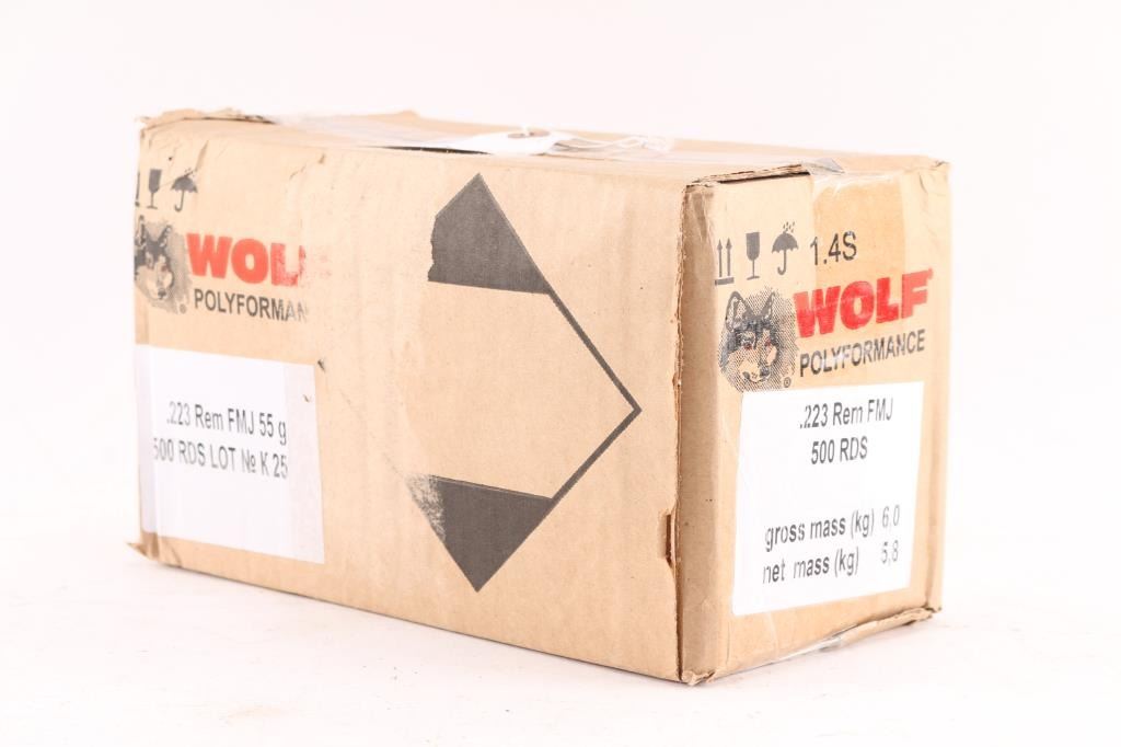 Unopened box of 500 rounds of wolf .223. FMJ , 55 grain, steel case, Berdan primed, non corrosive. 25-20 round boxes.